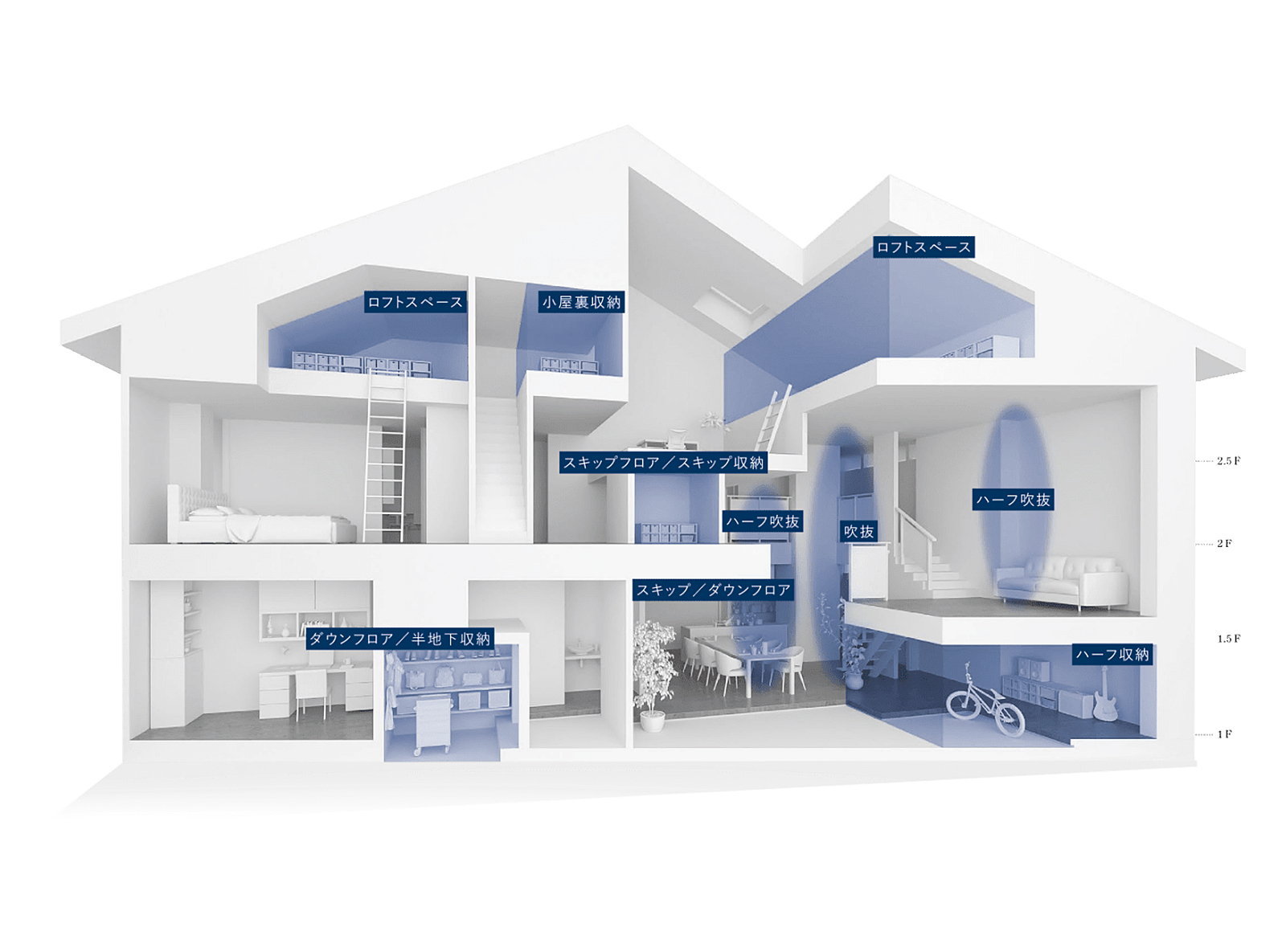 日本の住宅が約30年で建て替えられる要因は収納不足にあると考える同社。その解決策として、バーチカルスペース(タテ空間)を生かした多層構造(2回建住宅の5層構造)を提案しています。限られた敷地でも、ハーフ収納やスキップフロア、ロフトなどの豊富な収納空間とボーナススペースを確保。屋根遮熱断熱工法により、ロフトは季節を問わず快適に使用できます。