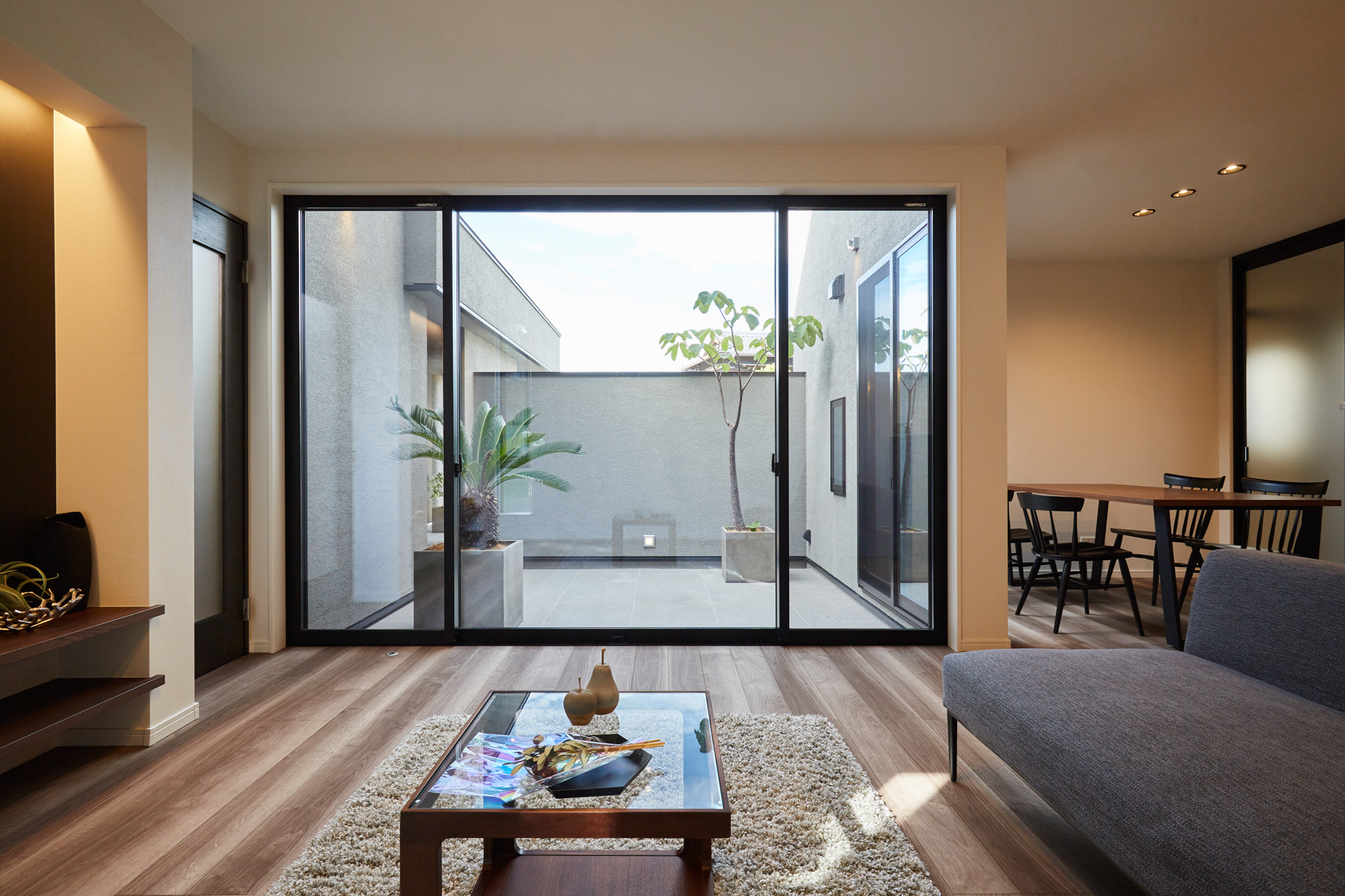 外からの視線を気にせず、光や風をたっぷりと取り込むコートヤード(中庭)のある家づくりを得意としています。外でもなく、内でもない、特別なプライベートな空間で、家族の団らんや、お子さまの遊び場として楽しめる、ぜいたくな住まいを提案。周囲を気にせず、家族の時間を豊かに育む暮らしをデザインします。