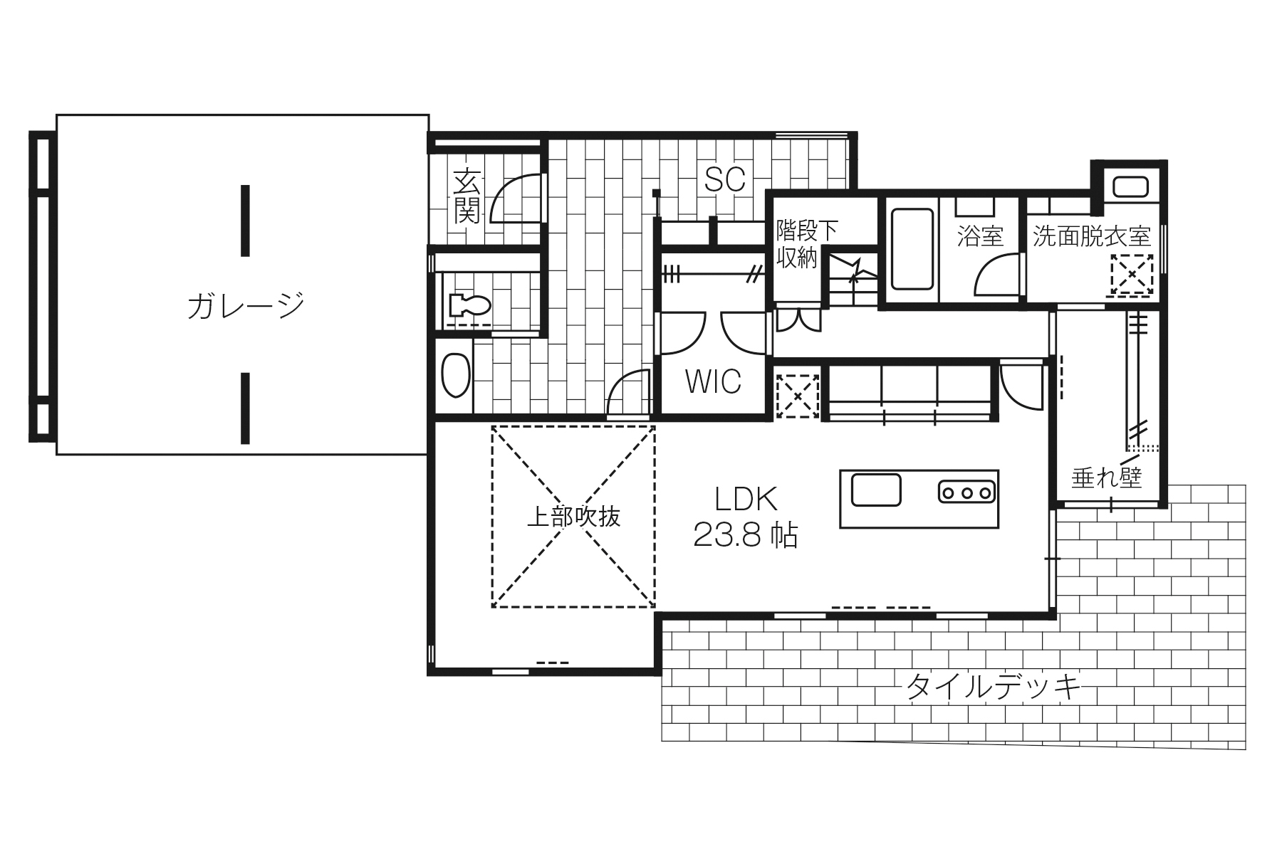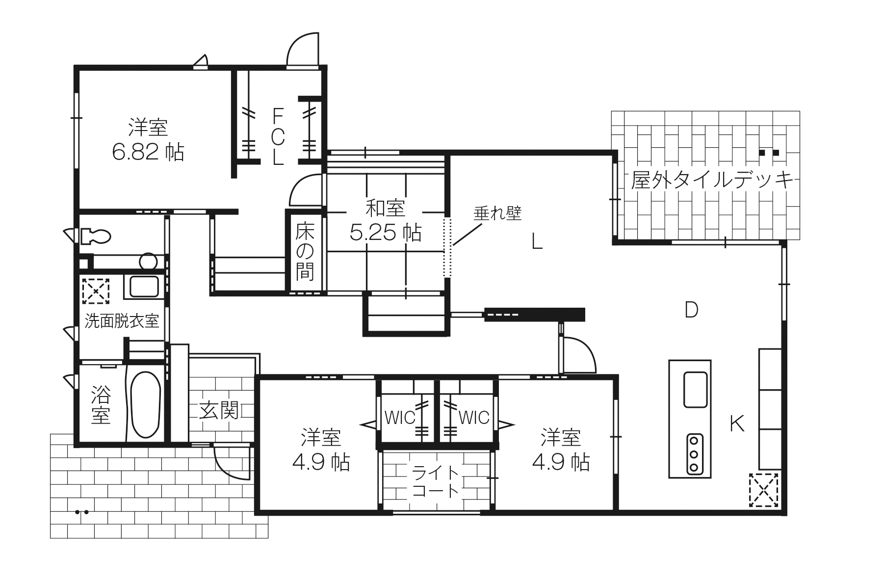 横へと広がる大屋根のある平屋住宅は、落ち着いたなかに高級感を醸す人気の住宅です。主寝室と子ども部屋に廊下を挟むことで家族それぞれのプライベートも確保。中庭(ライトコート)やタイルデッキを設けることで屋外とのつながりや家族がくつろぐ場所も。家族が落ち着ける最適な距離感の間取りです。
