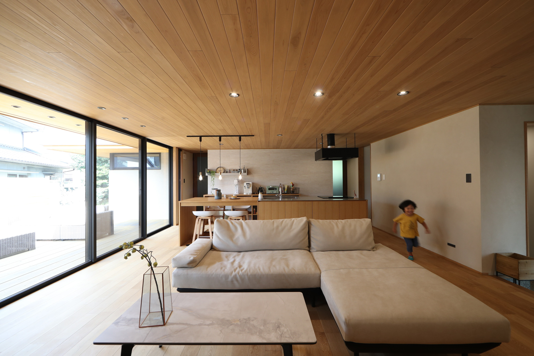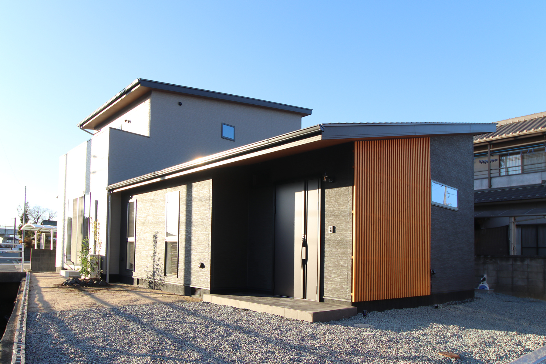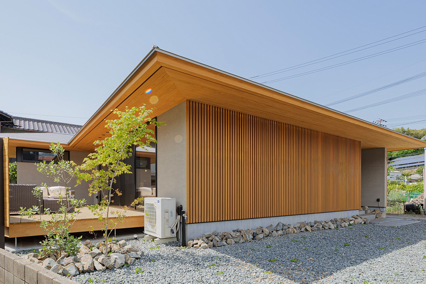 深い軒と高さを抑えた縦格子デザインの平屋です。夏の強い日差しを遮り、冬には室内の奥まで光を取り込み、一年を通して快適に過ごせます。木目の美しい天井が広がるLDK、その先につながるウッドデッキ、雨樋がなくスッキリとした外観。デザイン性と快適性、機能性を高次元で両立させた、こだわりの詰まったお家です。