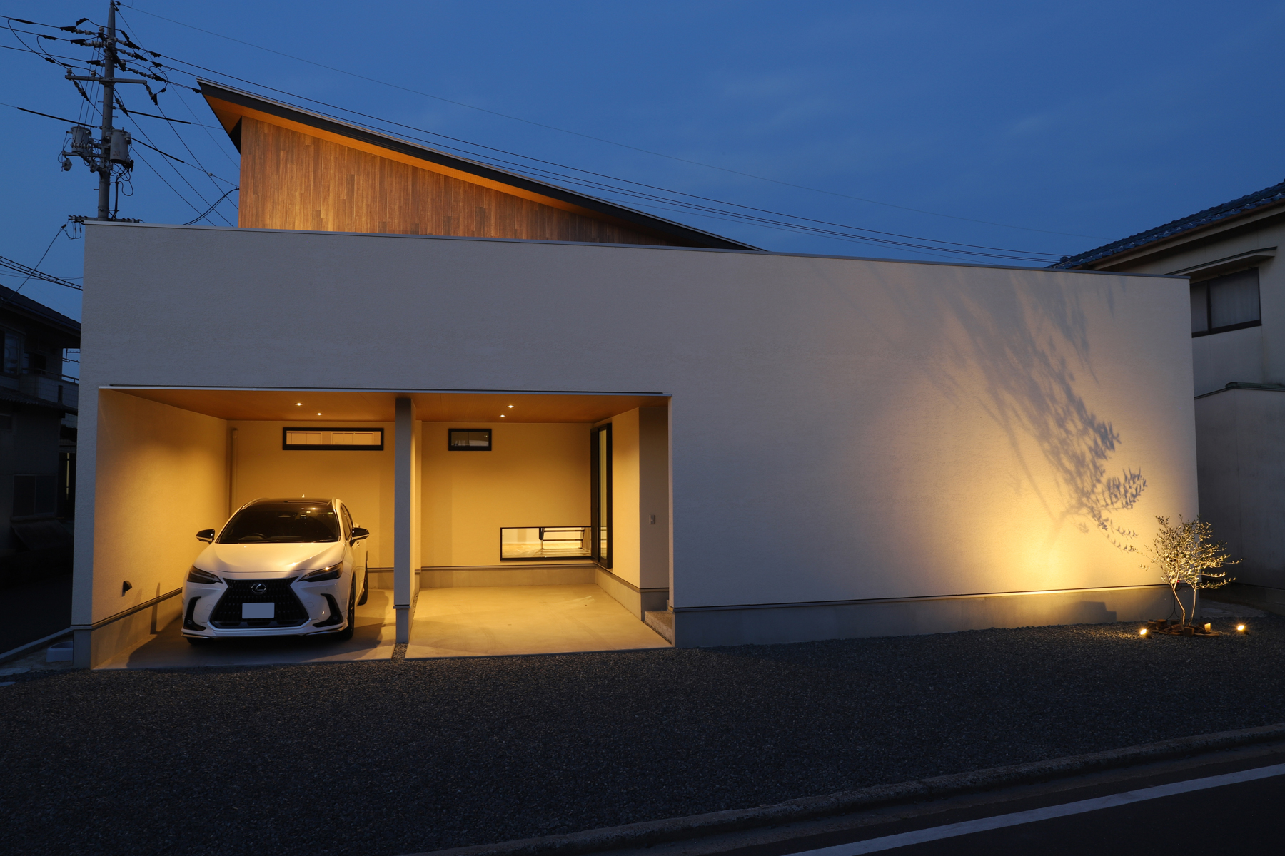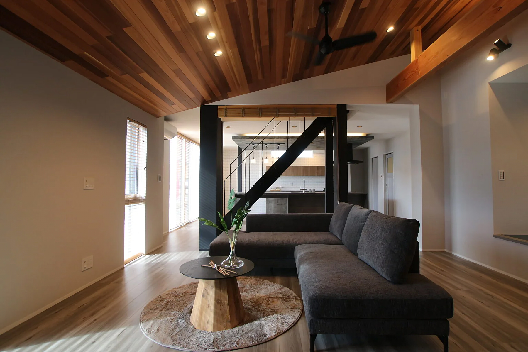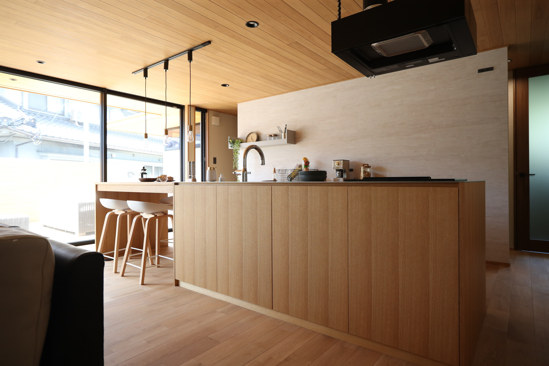 深い軒と高さを抑えた縦格子デザインの平屋です。夏の強い日差しを遮り、冬には室内の奥まで光を取り込み、一年を通して快適に過ごせます。木目の美しい天井が広がるLDK、その先につながるウッドデッキ、雨樋がなくスッキリとした外観。デザイン性と快適性、機能性を高次元で両立させた、こだわりの詰まったお家です。
