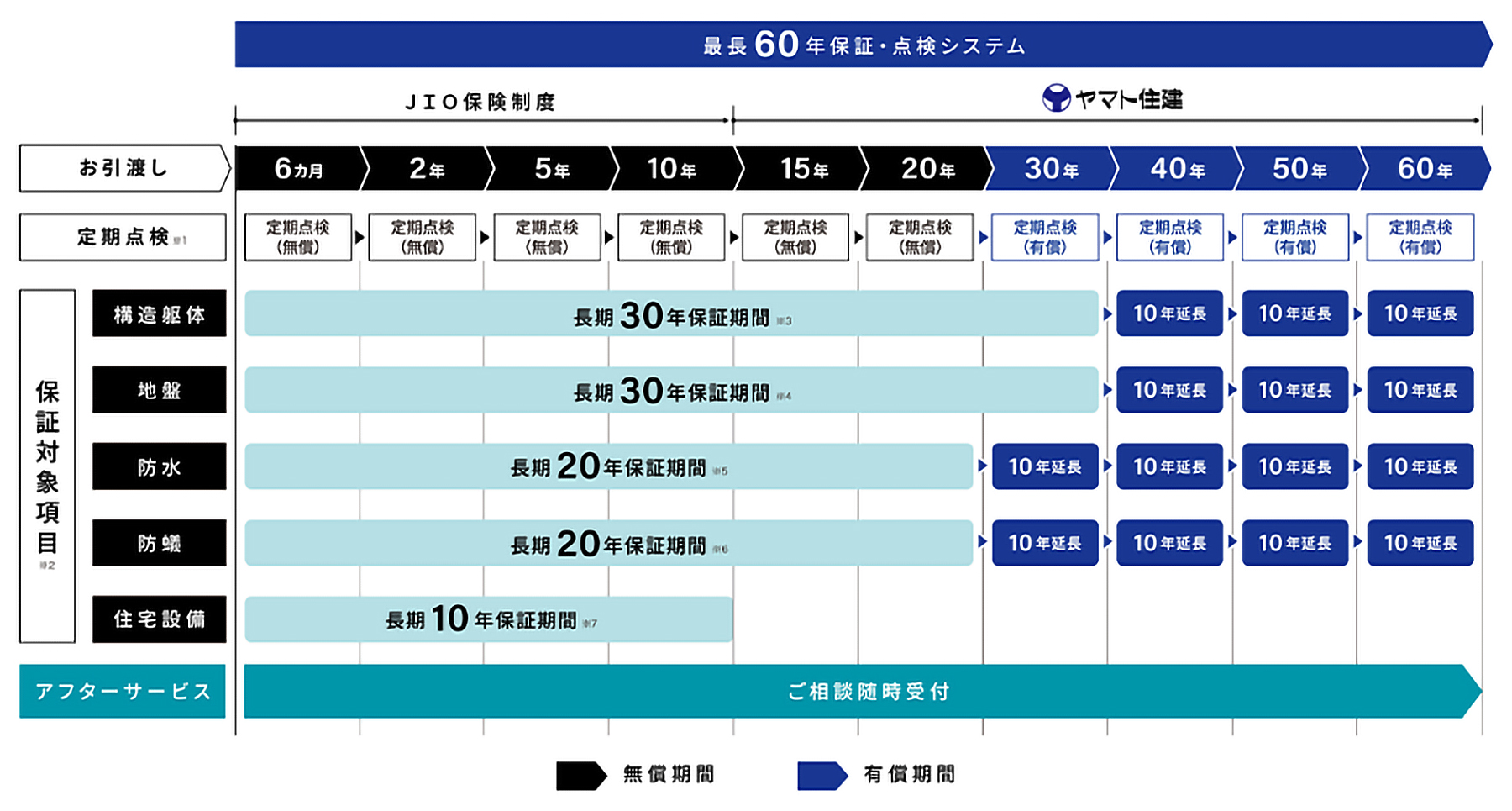 「ヤマト住建」では、引き渡し後も安心して暮らせるよう、6ヵ月目から20年目まで定期点検を実施。構造躯体は最長30年、防水は20年の長期保証に加え、10年ごとの有償メンテナンスで最長60年保証を実現しています。住宅設備も10年保証で自然故障に対応。さらに遠隔サポートツール「SynQ Remote」により、些細な相談も迅速に対応。長期にわたり快適な暮らしをサポートする充実の保証体制です。