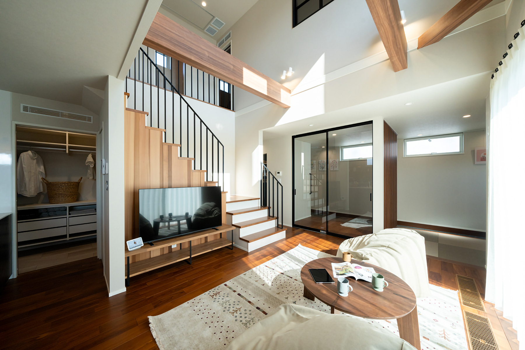 アウトドアリビングを楽しめるデッキやロジア、使い道が広がる大きなエントランス、空間を活用したステップインロフトなど、居心地よい空間をつくるための仕掛けが満載のモデルハウスです。リラックスダイニングや和室も備えるLDKは自然と家族が集いたくなる場所。ルームエアコン1台で年中いつでも快適な全館空調「YUCACO」システムを搭載しています。