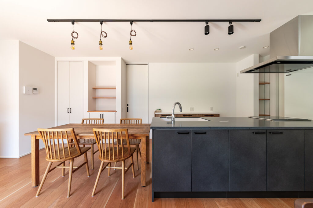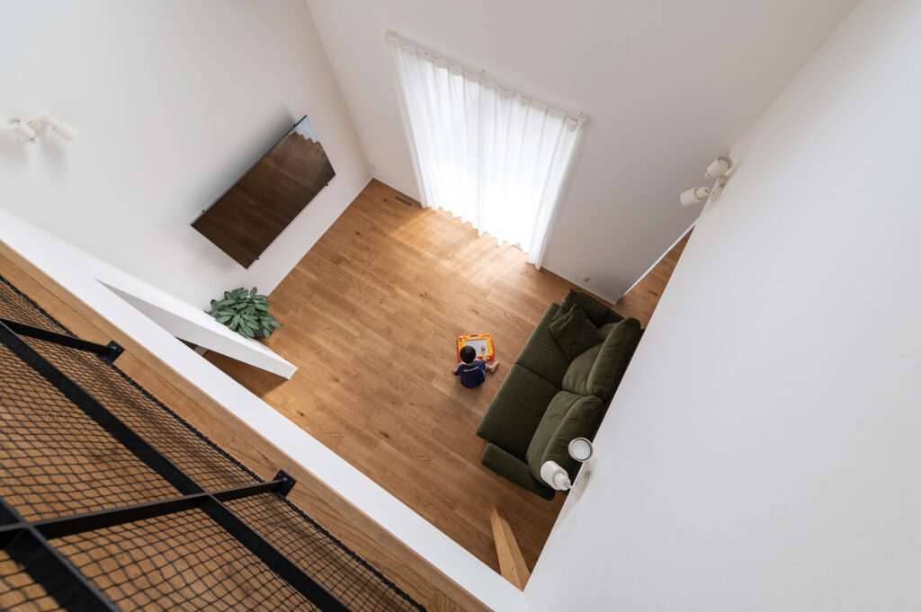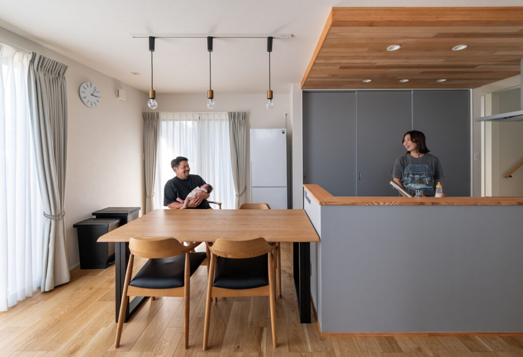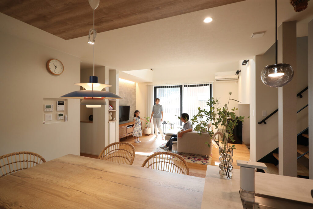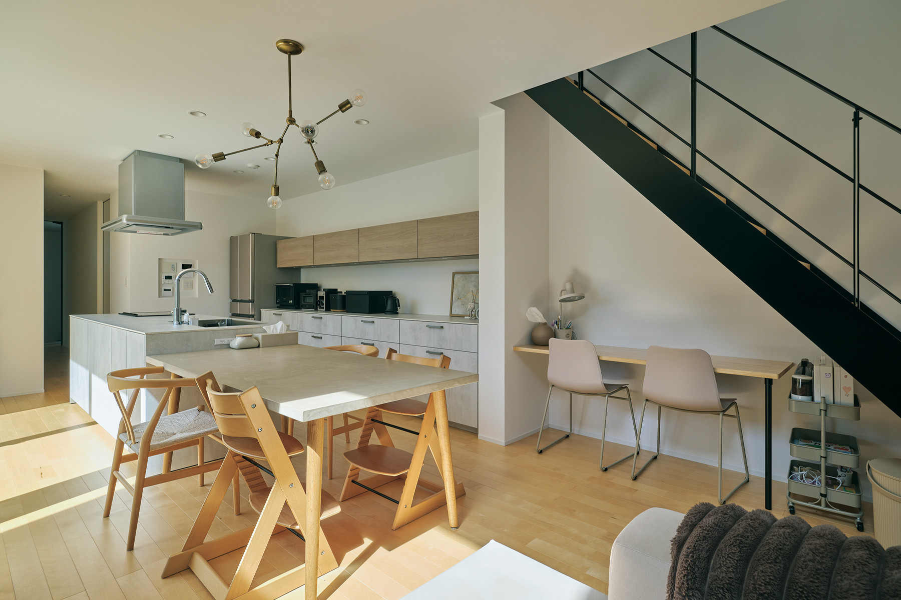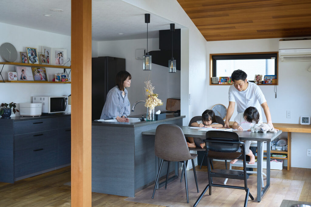 スタイリッシュな佇まいながら、その室内はおおらかな吹き抜けから自然の光がたっぷり届く心地よい空間。ゆったりとした時間が流れるLDKには、元気いっぱいのお子さまたちと優しいご夫婦の笑顔があふれています。広々としたアイランドキッチンで夫婦そろって料理を作ったり、庭でお子さまたちと一緒に遊んだり。日々の暮らしがますます愛おしく、楽しみが膨らむ住まいになりました。
