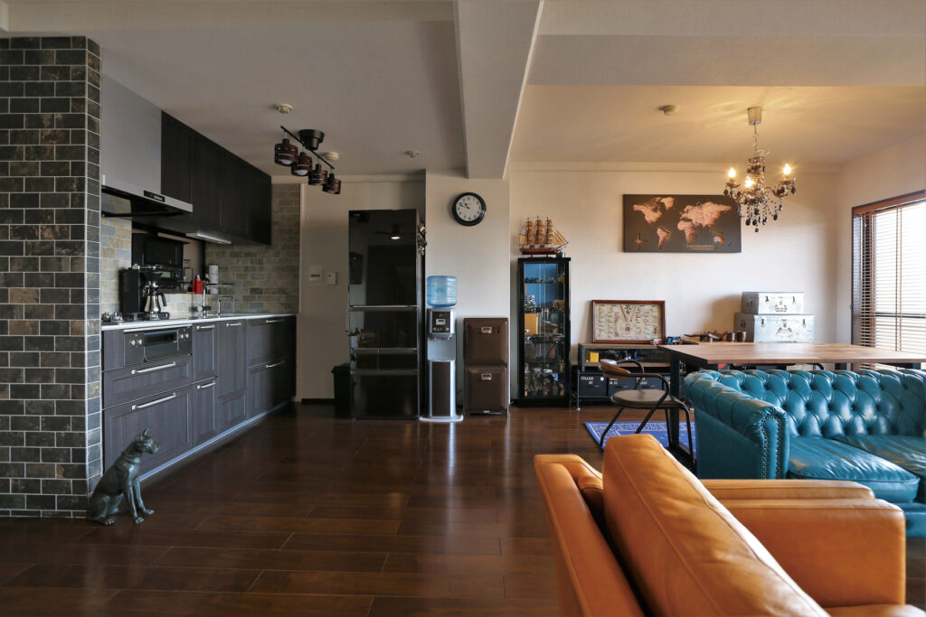 築25年の中古マンションを購入したAさんは、「ギビング・アース」に依頼し、独立した間取りを広々としたLDKへリノベーション。コーディネートは、選び抜いたデニム調の輸入壁紙が起点に。時間をかけて集めた家具や雑貨がバランス良く配置され、どこを切り取っても絵になる空間です。大好きな家具と愛犬に囲まれた開放的な住まいは、帰るたびに心が整うような、何とも言えない幸福感に満たされています。