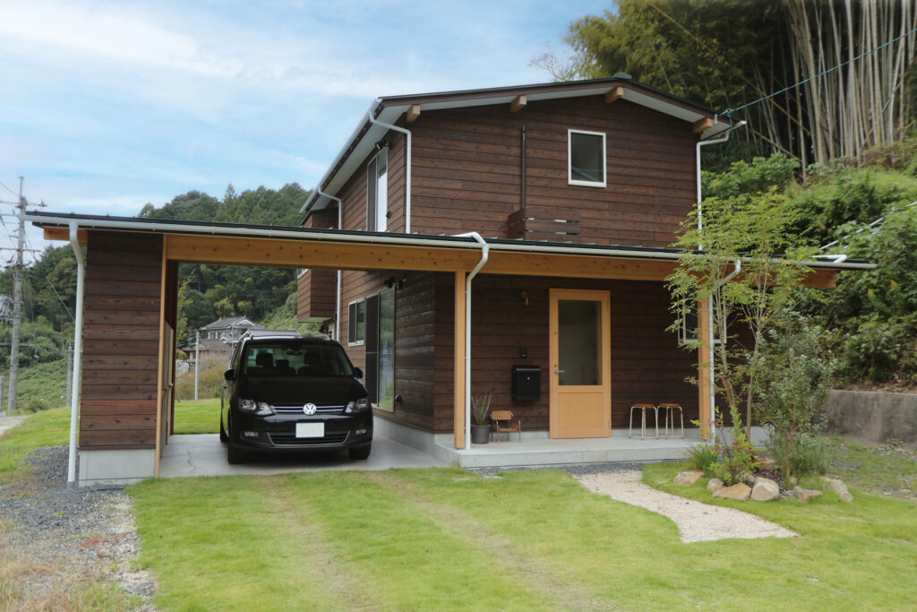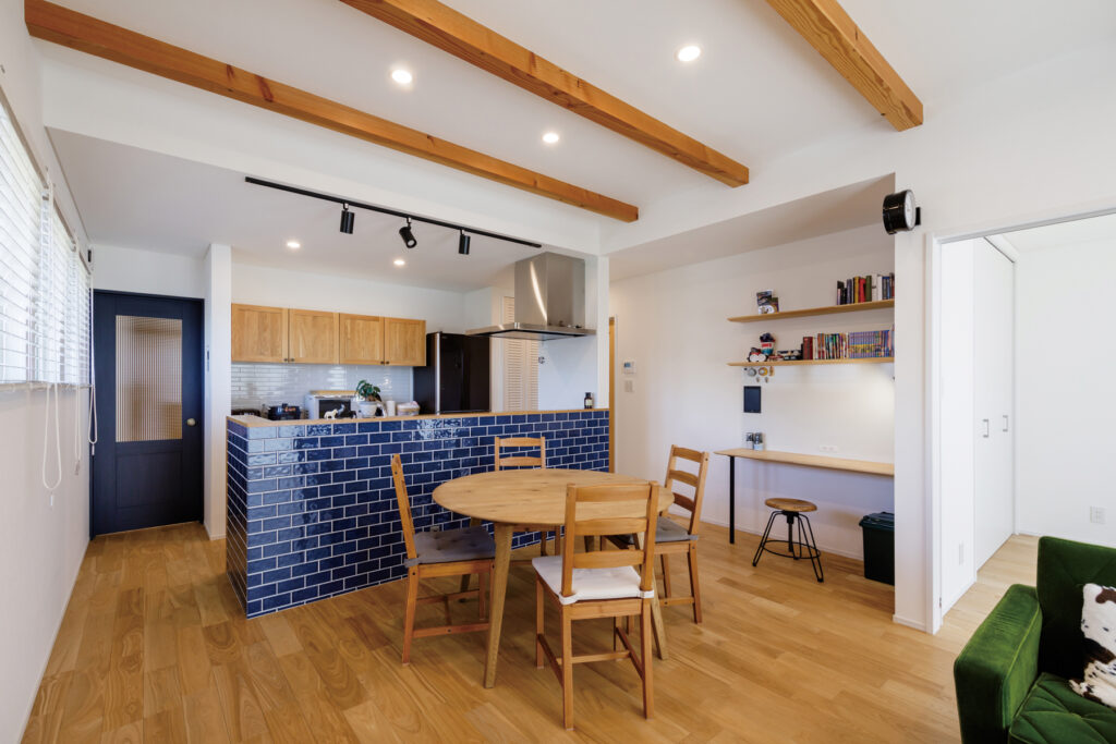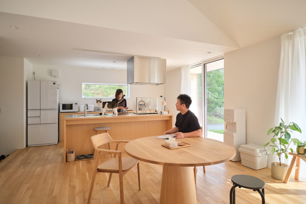 緑の風景に溶け込む山小屋風の家は、吹き抜けのダイニングを中心に、大きな窓から光と風が入る開放的な空間。タイル張りのキッチンは、一段下がり食卓との会話が弾む設計で、部屋全体を見渡せます。「家事動線」「スキップフロア」など多くの要望は、「美作土建」の柔軟な提案により予算内で実現。利便性の高い場所から移住した奥さまも、「子どもが伸び伸び暮らせる環境」の良さを日々実感されています。