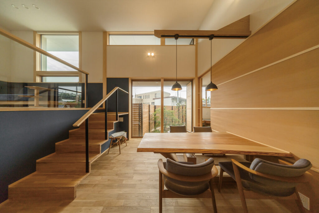 山の麓の傾斜地にある土地で、整地よりも建物の魅力にコストをかける設計が提案されました。元の地形を生かし、高低差を建物内に取り込んだ4層のスキップフロアの家です。玄関ホールから数段ずつ上がる構造で、吹き抜けのダイニング、中2階のリビング、2階の個室が続きます。職人の手間をかけた造作は工芸品のように美しく、ご夫婦は「家じゅうを眺めているだけで楽しい」と満足されています。