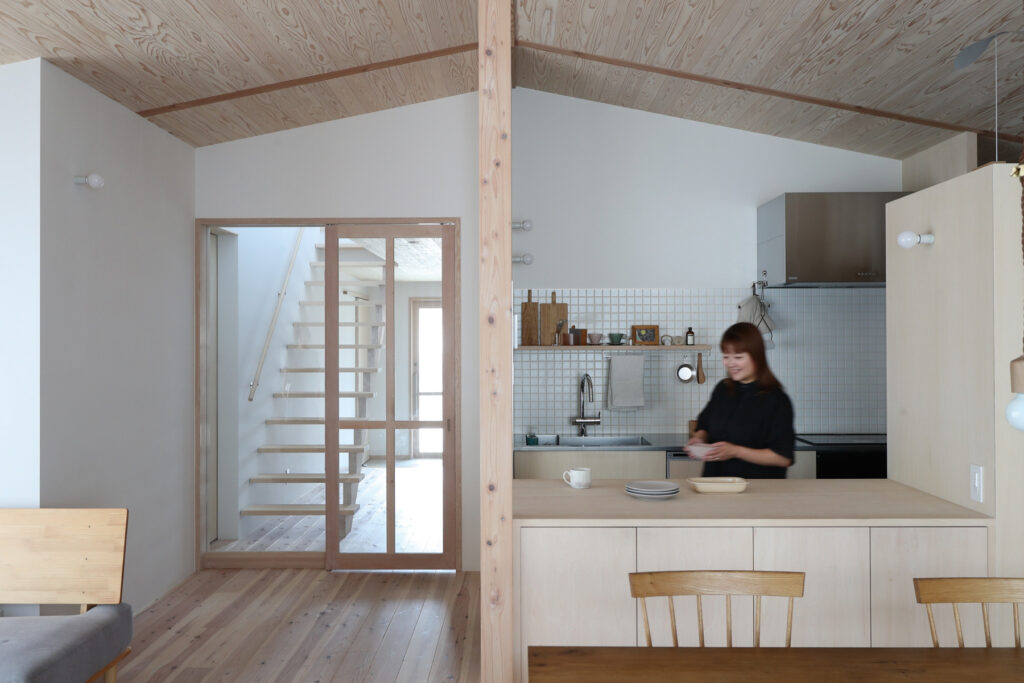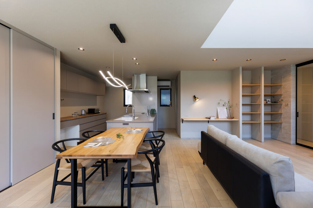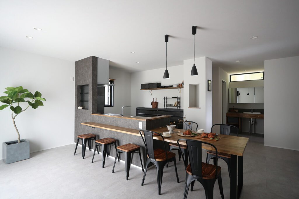 日常や家族の変化に寄り添い、快適な動線とゆとりある空間を両立させた平屋です。LDKと各個室をドアでつなぐ間取りを計画。個室はプライバシーを保ちつつ、家族のコミュニケーションを深められます。玄関から水回りへの動線はキッチンと回遊させ、生活機能をLDKと分離しました。玄関土間には美容師の奥さまの希望でヘアカットスペースも確保し、住み手ならではの幸せな日常を形にしています。