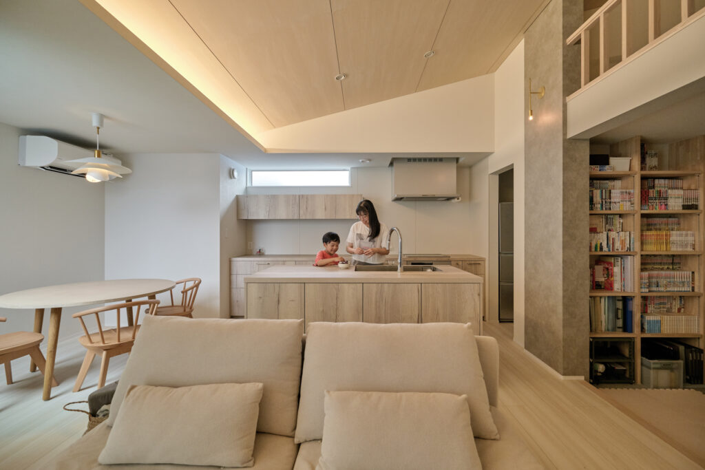 ホワイト・ベージュ・グレーの優しい色調で統一されたインテリアです。「GRAFTEKT」キッチンを中心に、奥さまのセレクトで家づくりがスムーズに進みました。リビングにはしごで上がるロフトはお子さまの遊び場。その下にはご主人希望のダウンフロアの本棚コーナー、奥さまはソファでくつろぐのが至福の時間。家族3がそれぞれ好きなことをしながらも、ワイワイと会話を交わせる心地よい距離感の住まいです。