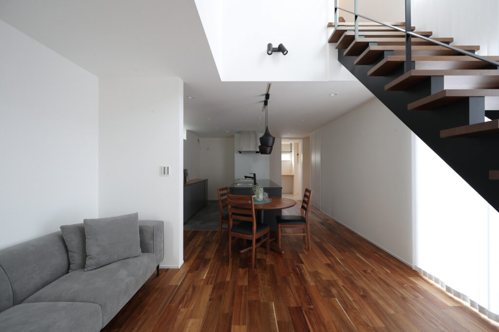 モノトーンにアカシアの床がぬくもりを添える室内に、主婦目線の使いやすい動線と可変性のある間取りが採用されたモデルルーム。回遊できるキッチンと水回りの動線は家事を短縮し、吹き抜けのリビングは家族だんらんに最適です。2階でプライベート空間を確保しつつ、断熱・気密に優れたスーパーウォール工法と耐震等級3を標準仕様になっています。