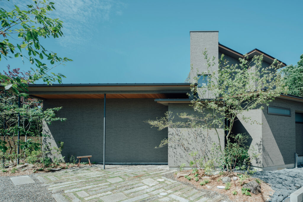 北側の緑を生かし、大きな窓を介してリビングや書斎が外とつながる間取りです。床の高さや視線を変えながら空間を緩やかに分けることで、くつろぎの場を演出。広めのタイルデッキは内と外を曖昧に結び、自由な過ごし方をかなえます。2階には借景が広がる書斎と、茶室のようにくぐって入る小さな間口を付けた客間を配置。日常を心豊かに過ごせる工夫が散りばめられた住まいです。