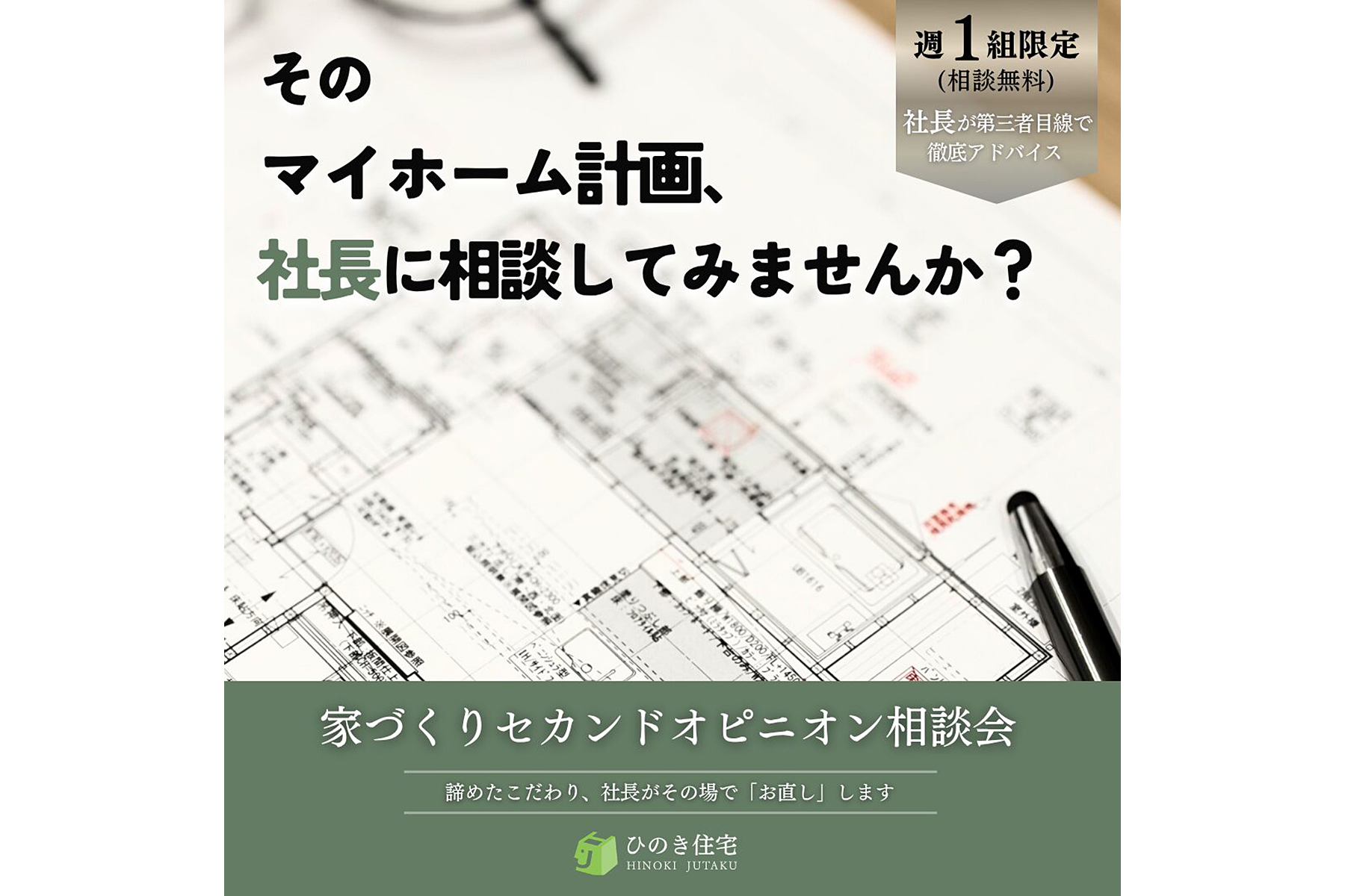 検討中のマイホーム計画、図面、土地、資金、時期など、家づくり全般について、週1組限定の無料相談会を開催。「ひのき住宅」の社長がプロの視点で相談に乗ってくれます。図面があれば、それをもとに間取りの工夫や資金計画を中立的な立場で提案。あなたが「なぜそうしたいか」という想いを丁寧に汲み取り、伸びしろを引き出します。