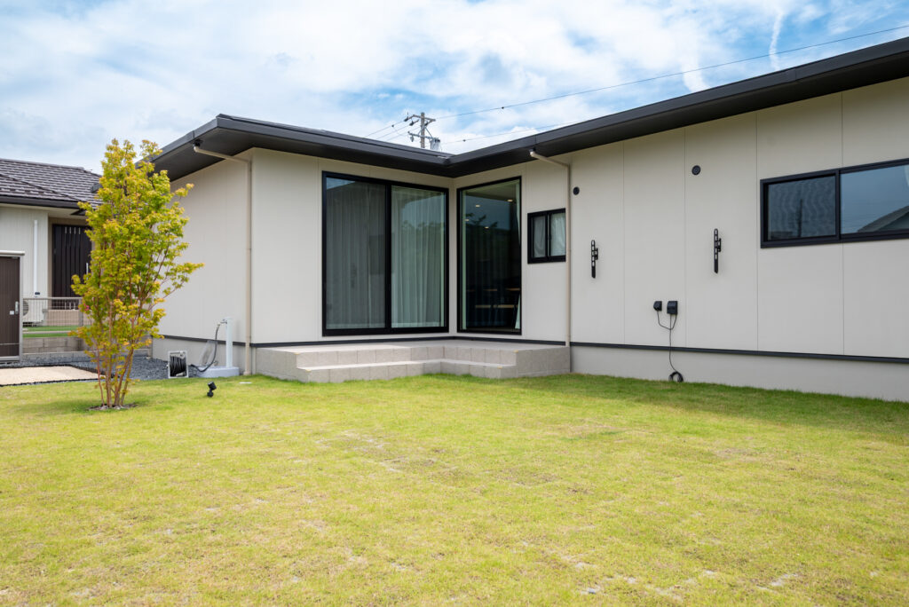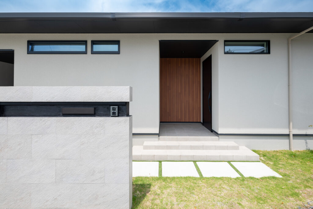軒の深さや屋根の勾配にこだわり、ご主人の理想を形にしたシンプルな平屋の住まい。雨風から車を守るビルトインガレージを組み込み、ウォームグレーとブラックでモダンにまとめています。L字型リビングからはワイドな窓を通して庭の緑を望み、視線が抜けることで実際の広さ以上の開放感を演出。自然を身近に感じながら、家族の絆を深める憧れの暮らしが実現しました。