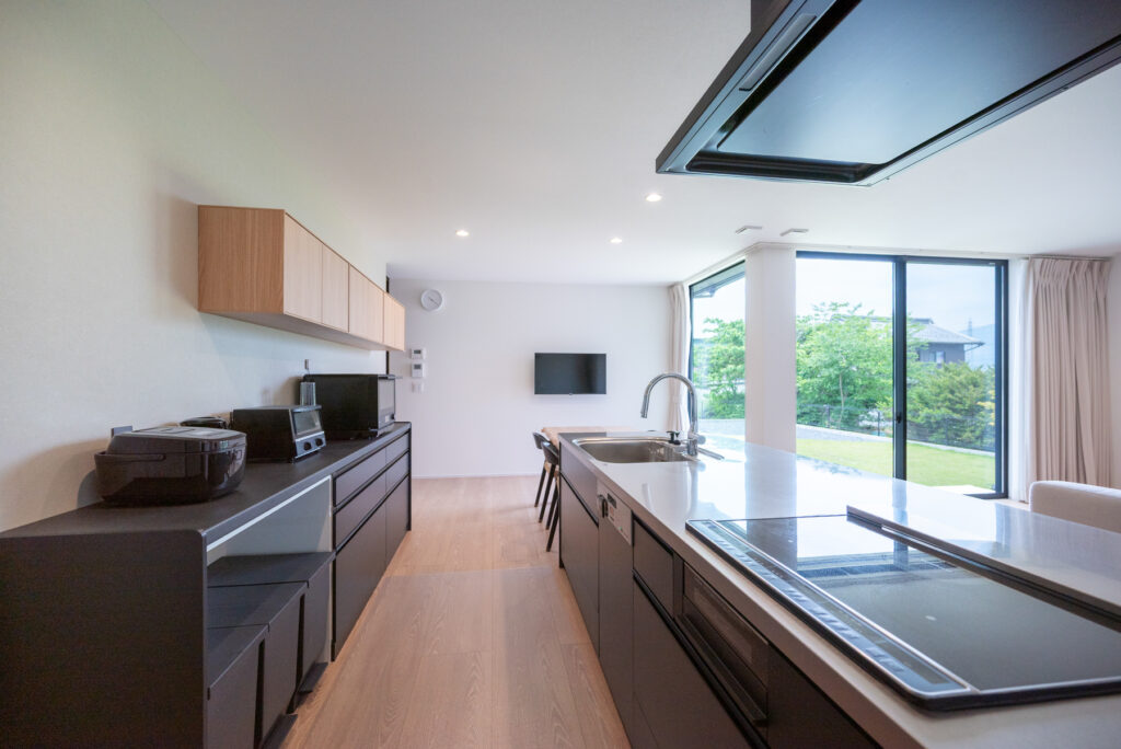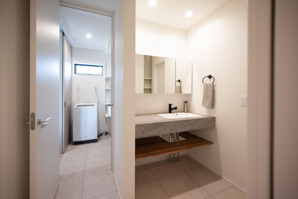 奥さまがこだわったのは、ストレスフリーな暮らしをかなえる回遊動線です。スタイリッシュなアイランドキッチンから脱衣室へ直接アクセスできる間取りは、移動がスムーズで家事の時短に大きく貢献。料理をしながらリビングや庭で遊ぶお子さまの様子を見守れる安心感も魅力です。ダイニング横並びのレイアウトは配膳や片付けも楽になり、毎日の暮らしやすさを高めています。
