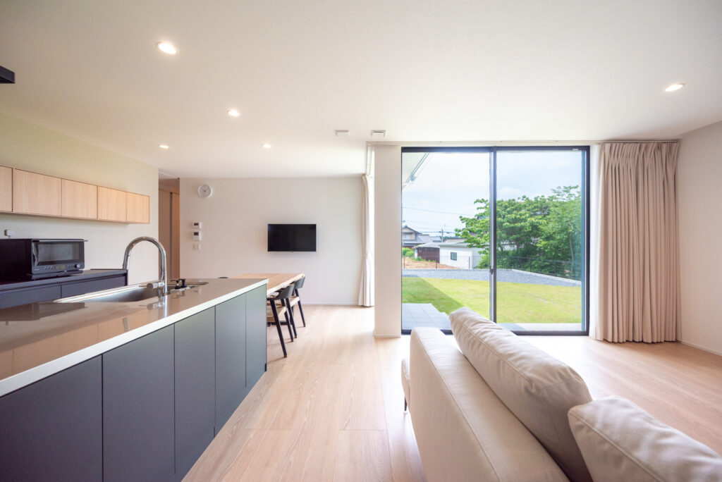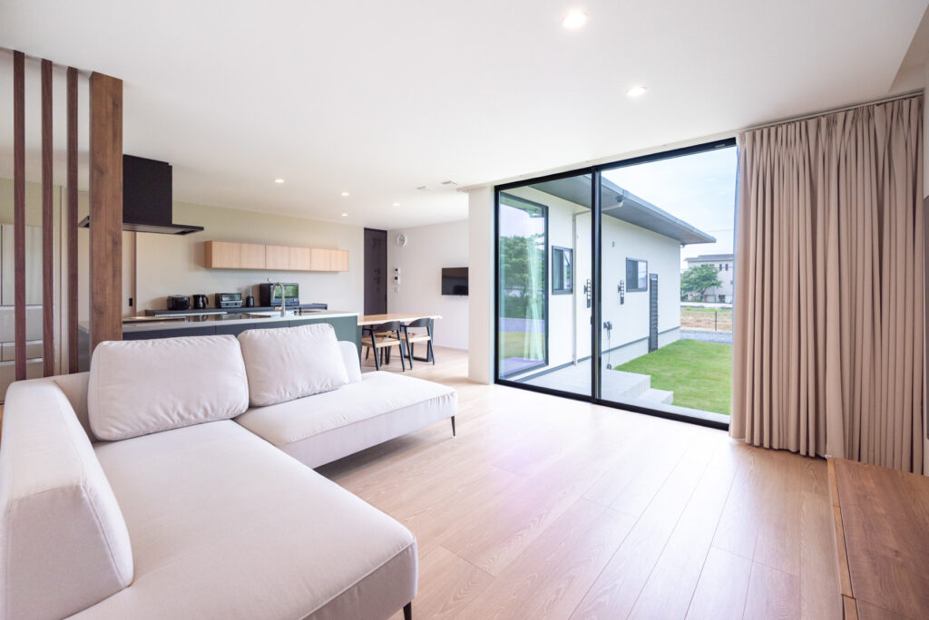 リビングドアを開けた正面に設けた大きなFIX窓は、空間に奥行きと抜け感をもたらします。庭のシンボルツリーであるもみじや遠くの山々を切り取る「ピクチャーウィンドウ」として機能し、四季折々の美しい景色を室内に取り込むのが魅力です。広々とした庭は、お子さまの遊び場やご夫婦で星空を眺める場所になるなど、家族のくつろぎの時間を豊かに彩ります。