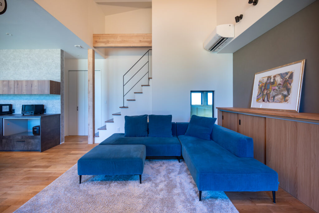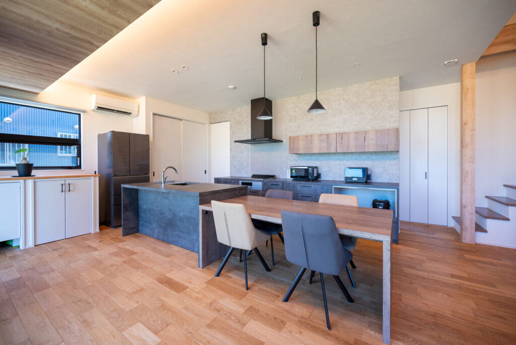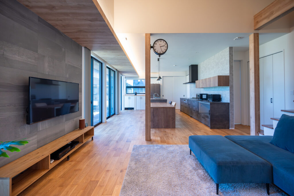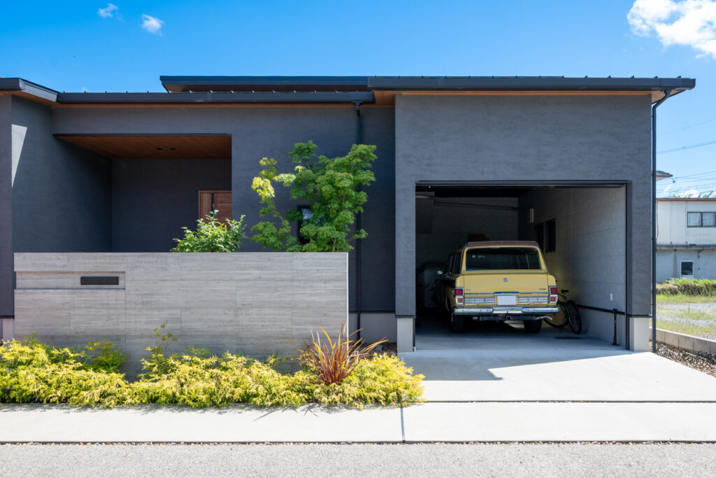 ダークグレーの落ち着いた外観の中に、お気に入りのヴィンテージカーを守るシャッター付きガレージを配置。家の中は、無垢床のぬくもりと間接照明が調和した心地良いLDKを中心に、家族が自然と集まる設計になっています。暮らしやすさや動線にも配慮されており、シンプルでありながらも、家族のこだわりが詰まった上質な住まいです。