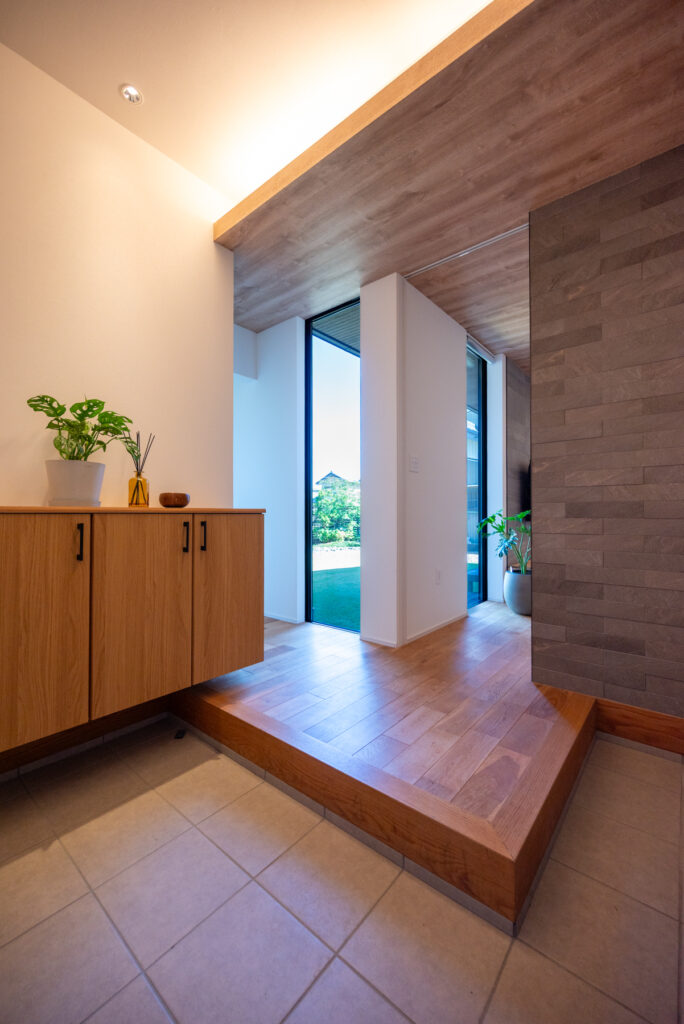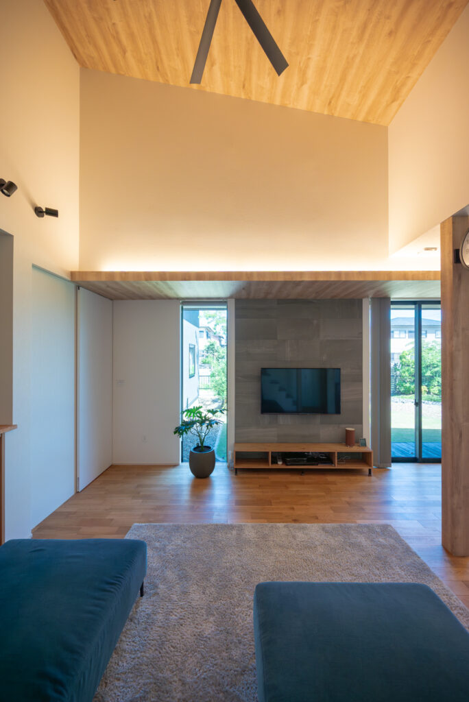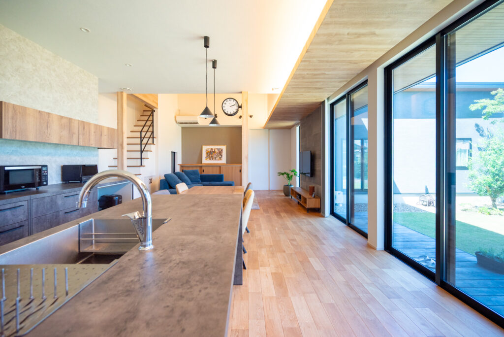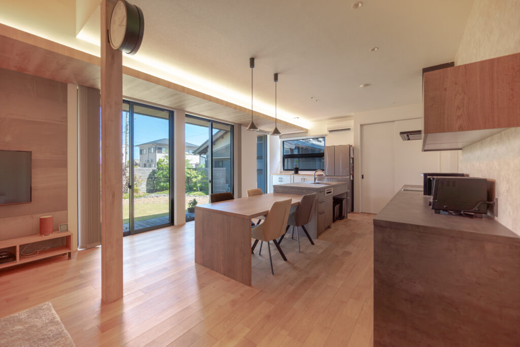 勾配天井とハイサッシが、実際の面積以上に広々とした開放感を演出するLDKです。オークの無垢床が心地よい足触りとぬくもりを与え、石目調の「エコカラット」が上品なアクセントに。使い勝手を追求した「グラフテクト」のⅡ型キッチンは、ご夫婦の身長に合わせた設計で毎日の調理も快適。バランスの取れた照明計画で、時間帯によって空間の雰囲気を変えて楽しんでいます。