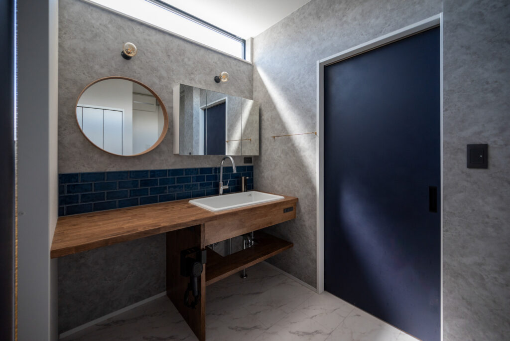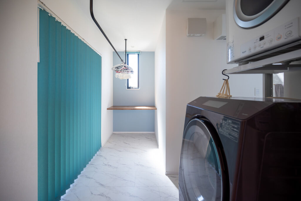 奥さまの家事負担を軽減する、機能的な水回り動線が魅力。キッチンからすぐにアクセスできるランドリールームは、洗濯から乾燥までを完結できます。ネイビーのクロスをアクセントにした洗面室には、二人並べる広々とした造作カウンターを採用。忙しい朝もスムーズに身支度ができそうですね。また、ロフトやガレージを眺める窓など、家族の楽しみが広がる工夫も満載です。
