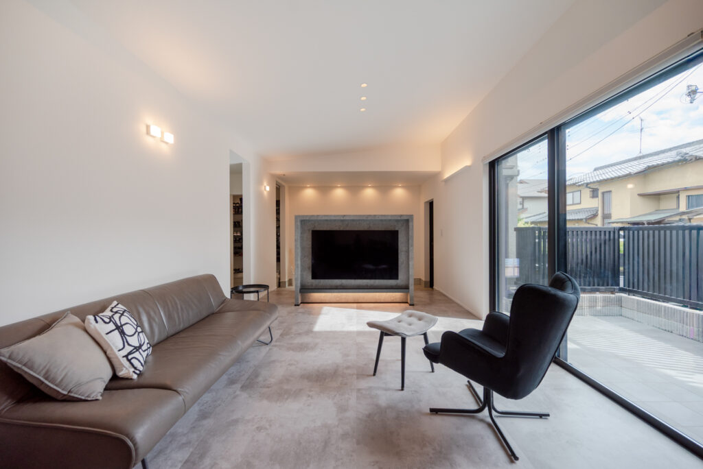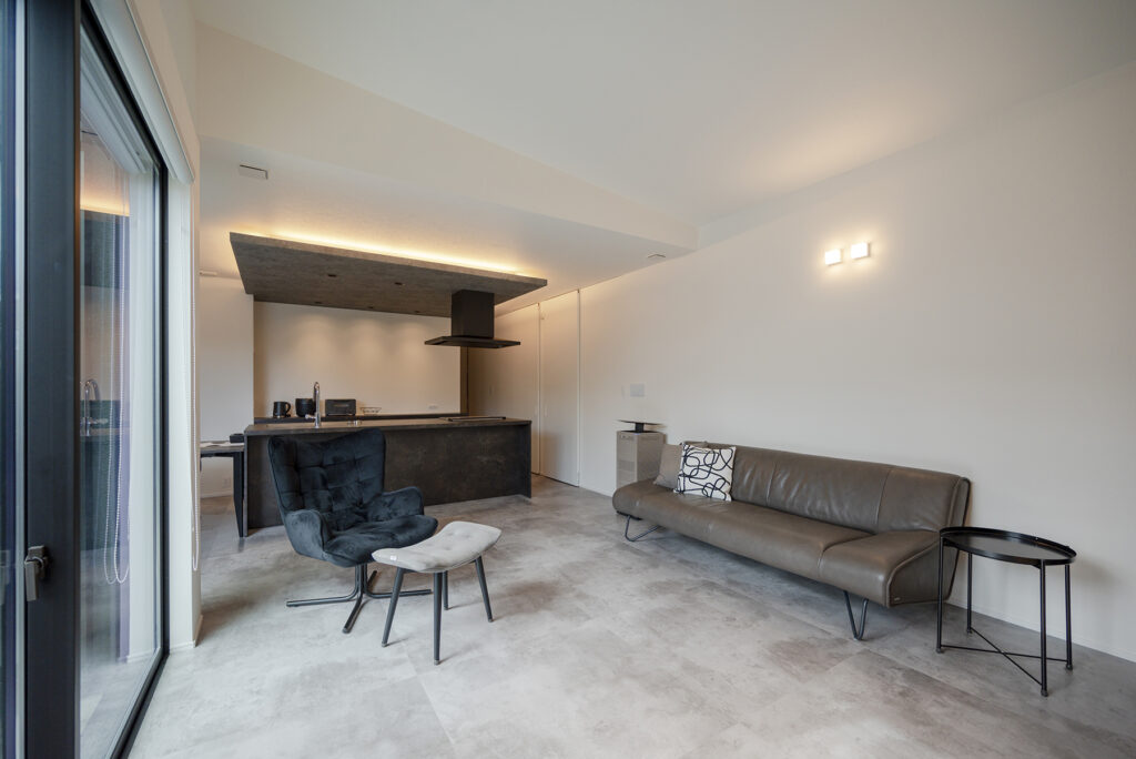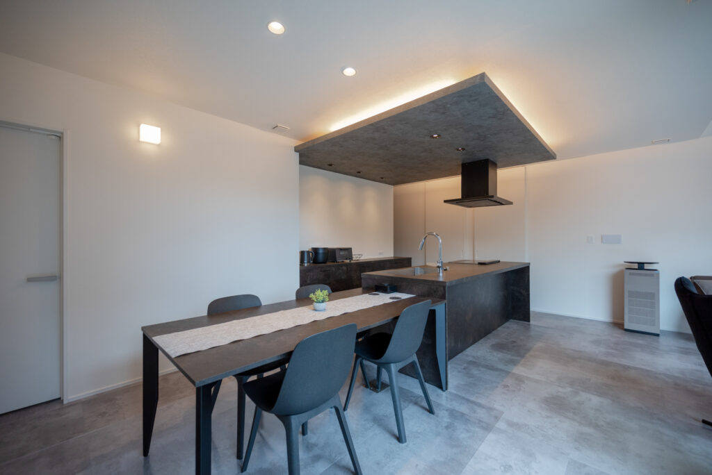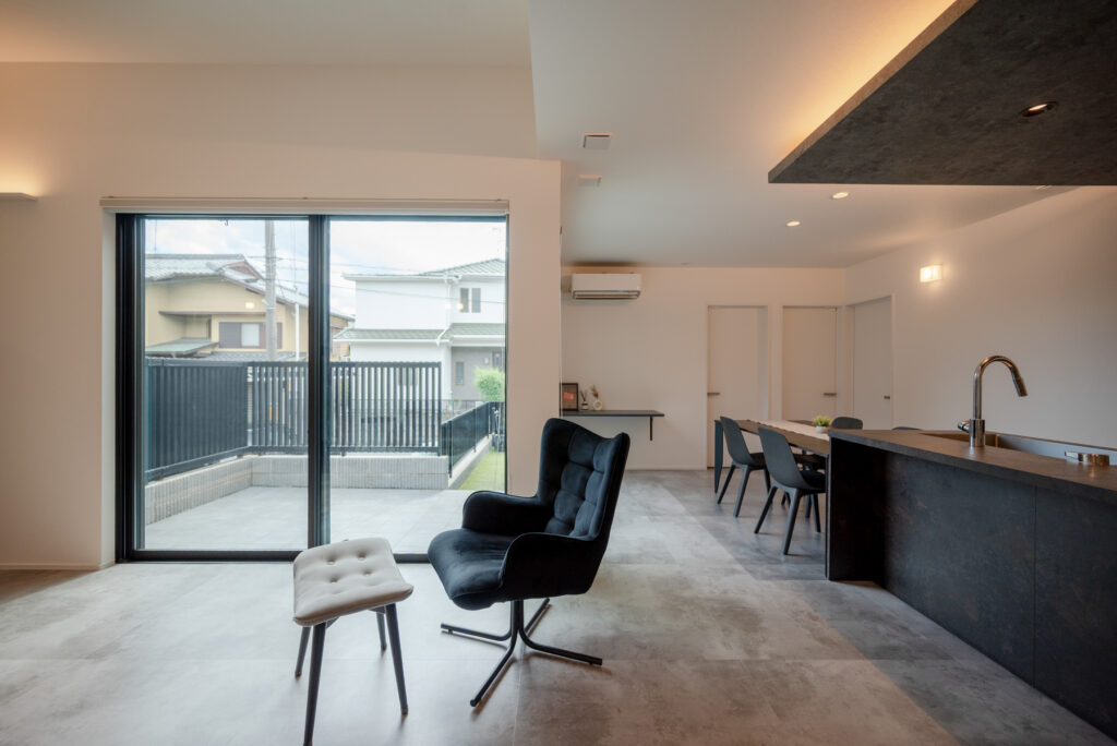 お子さまの小学校入学を前に、平屋での暮らしを選んだHさんご家族。廊下を設けず、リビングから各居室へと直接つながる間取りは、家族の気配を常に感じられる心地よさがあります。既存の石積みを生かした重厚感のある佇まいと、モノトーンで統一された室内が、洗練された日常を静かに包み込みます。