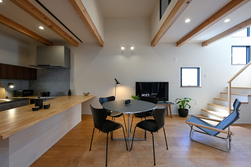 地元の木のぬくもりが室内に広がり、猫たちものびのびと駆け回ります。素材そのものが持つ質感や香りが、住む人の心を落ち着かせ、日々の疲れを癒やします。機能とデザインが調和した空間で、家族と猫が共に過ごす時間は、かけがえのないものになっていきます。これからも、この家で紡がれる物語が続いていきます。