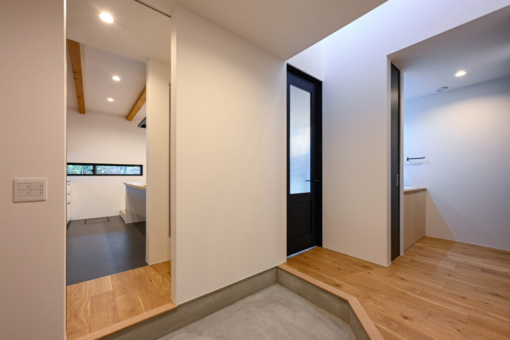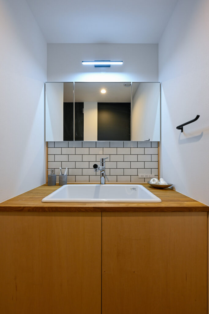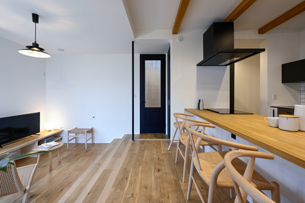コンパクトな空間ながら、室内に立つと予想以上の広がりを感じられます。異なる形状を重ね合わせた構成が、見る位置によって多彩な景色を生み出すからです。リビングからダイニング、そして個室へと移動するたびに、切り取られた景色が変化していきます。決して大きくはない住まいに、豊かな奥行きが宿っています。