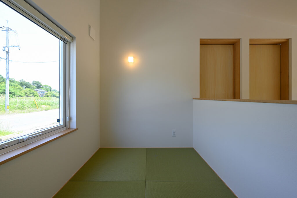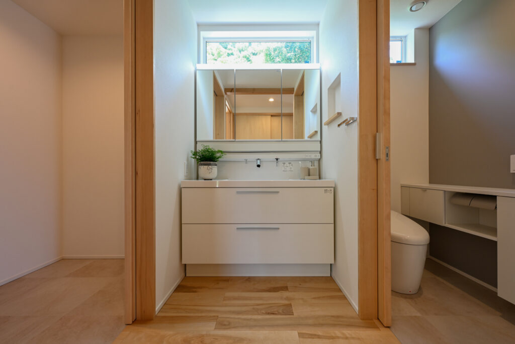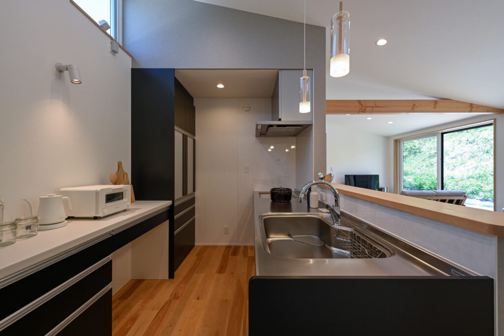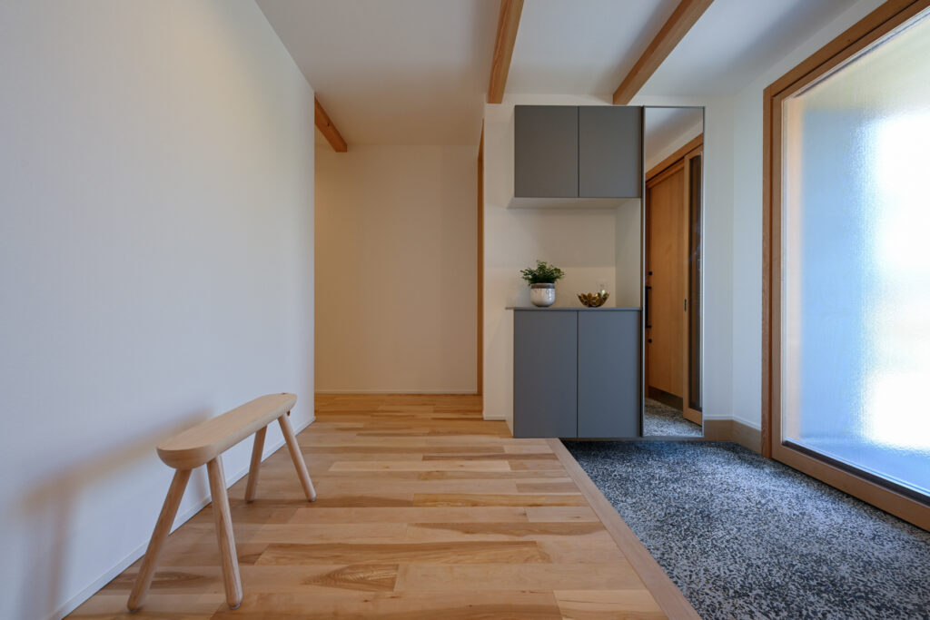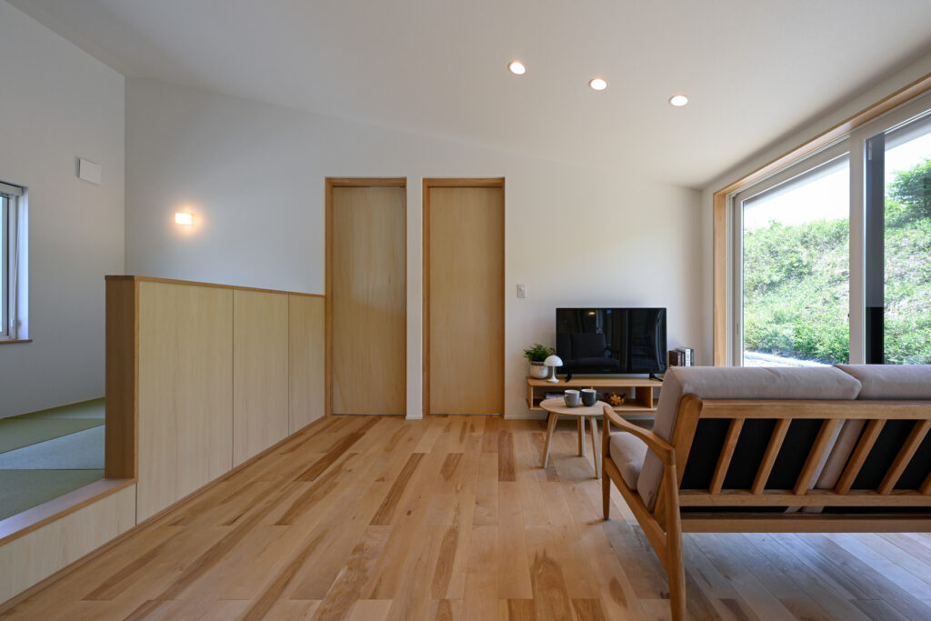 既製品をできるだけ使わず、職人の手仕事によって仕上げられた住まいです。木の質感が足裏に伝わり、壁の表情が光の加減で変化する様子を、家族は毎日感じています。朝の光が差し込む時間、夕暮れ時の柔らかな陰影。季節ごとに表情を変える山の景色とともに、暮らしに静かな喜びをもたらします。