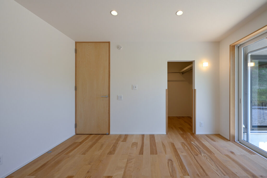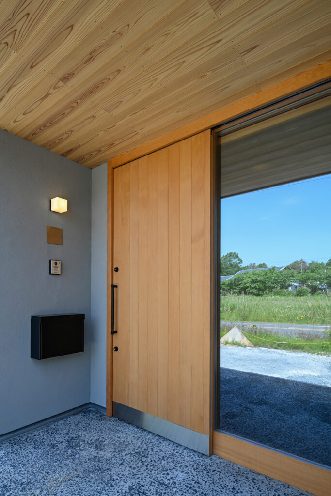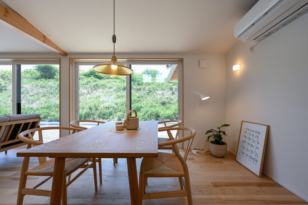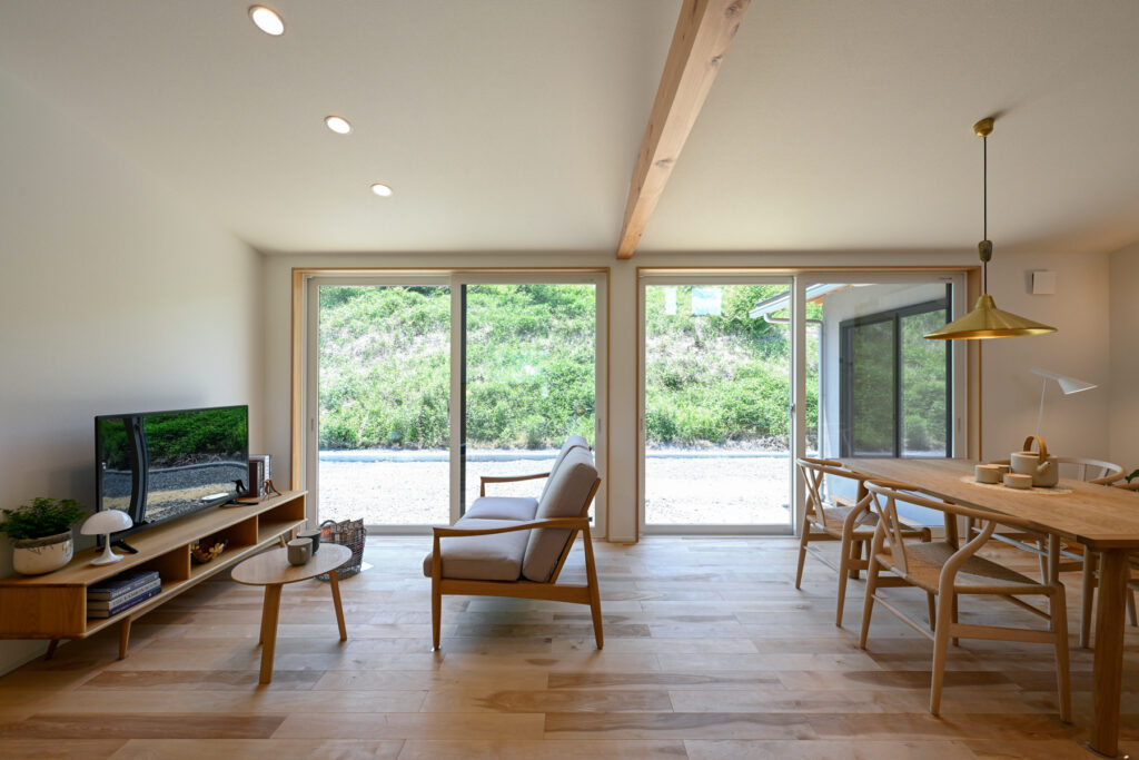 道路からの視線を遮るように、山と建物で庭を囲んだ設計が特徴です。庭でバーベキューを楽しむ際も、周囲を気にせずリラックスできる空間が生まれました。リビングや個室の窓は山側へ向けられ、緑豊かな景色を日常的に眺められます。外部からの視線を意識することなく、家族が自由に過ごせる環境が整っています。