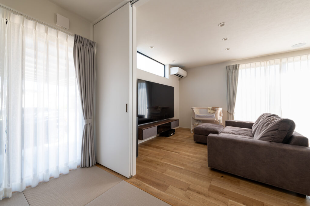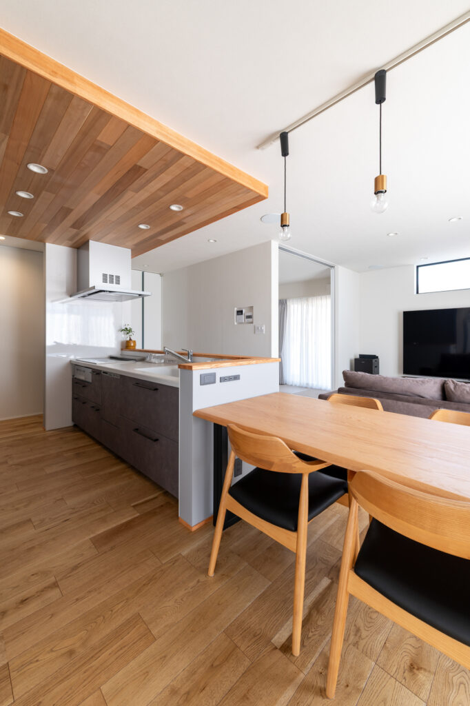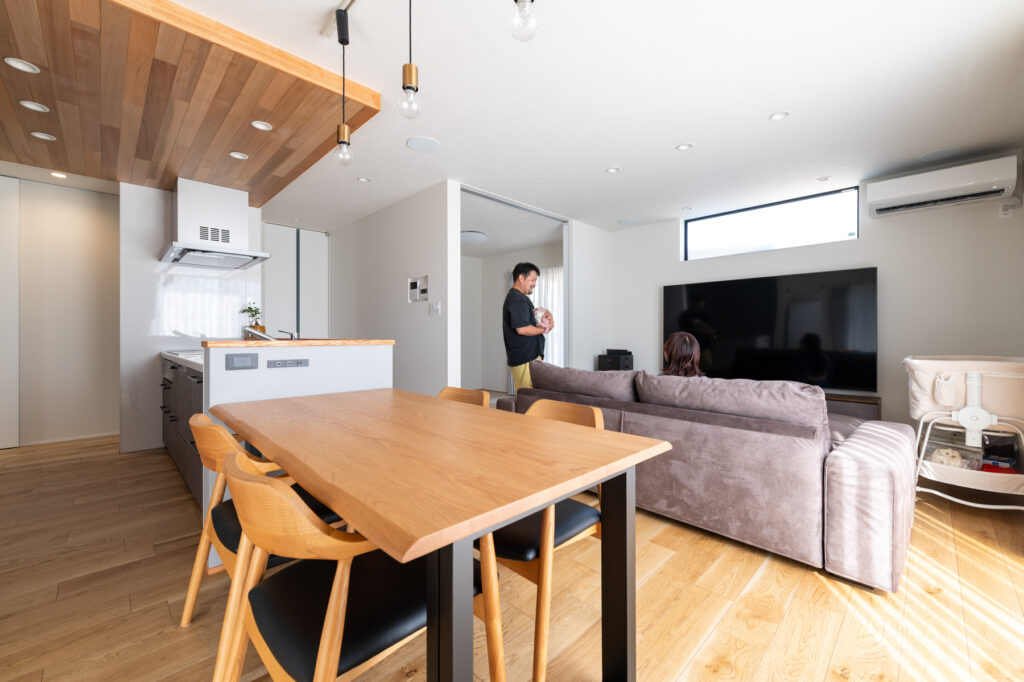 2025年の夏、待望の赤ちゃんを迎えたSさんご夫婦の新居。ゆとりある敷地に佇む二階建ては、シンプルモダンな佇まいの中に、陽光と風を存分に招き入れる設計です。淡いグレーで統一された室内に、床材や天井の木目がぬくもりを添え、上品でニュアンスに富んだ表情を生み出しました。心安らぐLDKは、家族の日常に寄り添う穏やかな時間を紡ぎます。