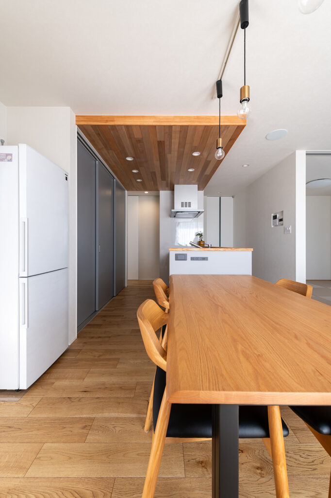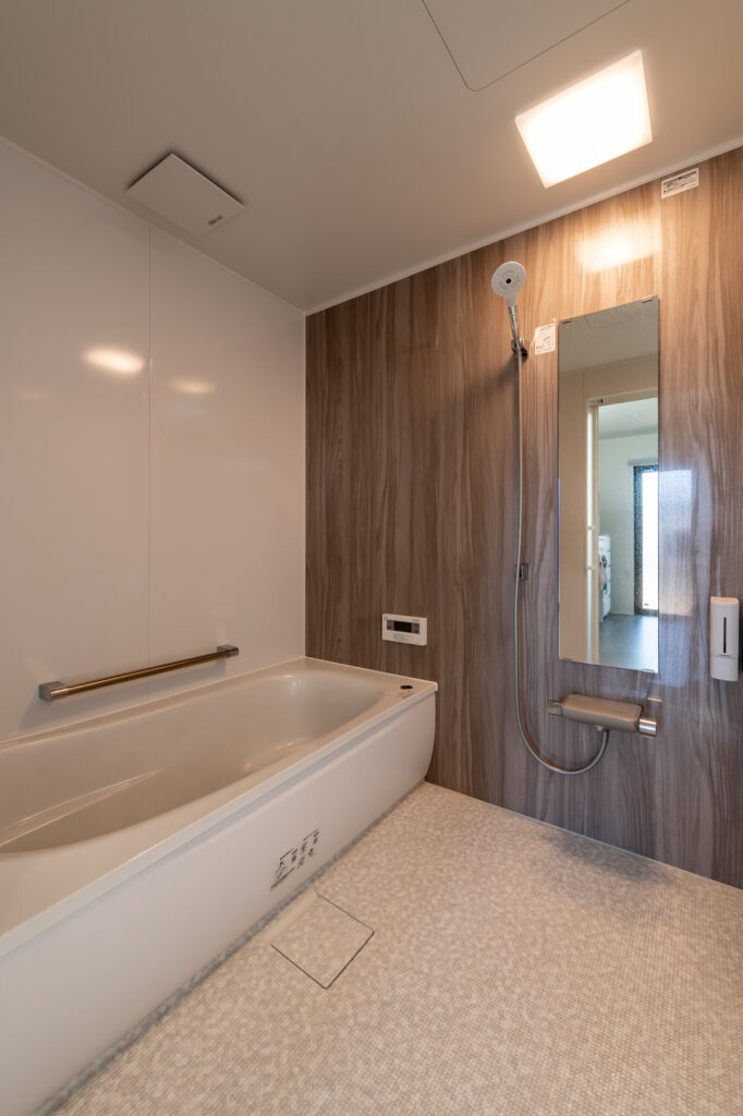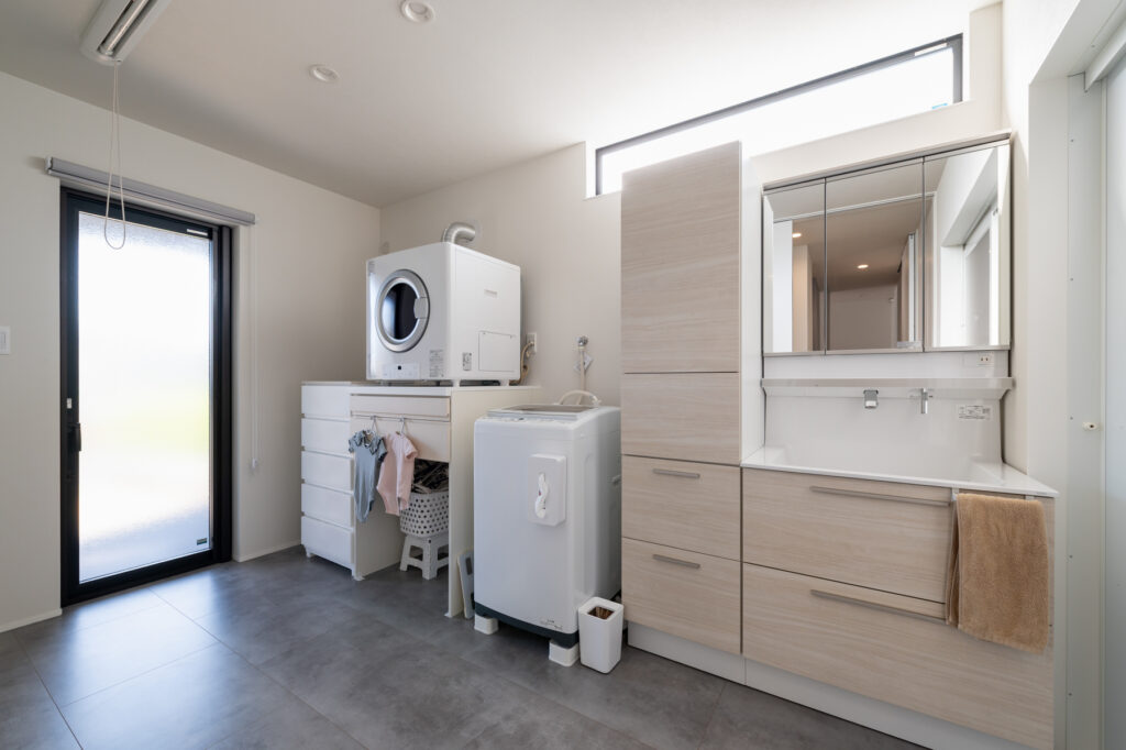 キッチンからはリビングや和室まで視界が通り、お子さまを常に見守れる安心感があります。コンパクトに整えられた動線は、日々の家事負担を大幅に軽減。ランドリールームを兼ねた洗面室では、室内外どちらへも洗濯物を干せる工夫があり、天候に左右されない快適さを実現しています。キッチン背面の扉付き大容量収納は、生活感を巧みに隠す役割を果たします。