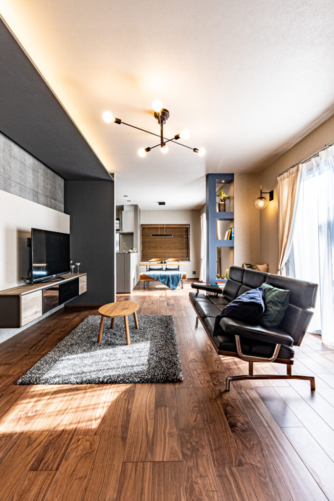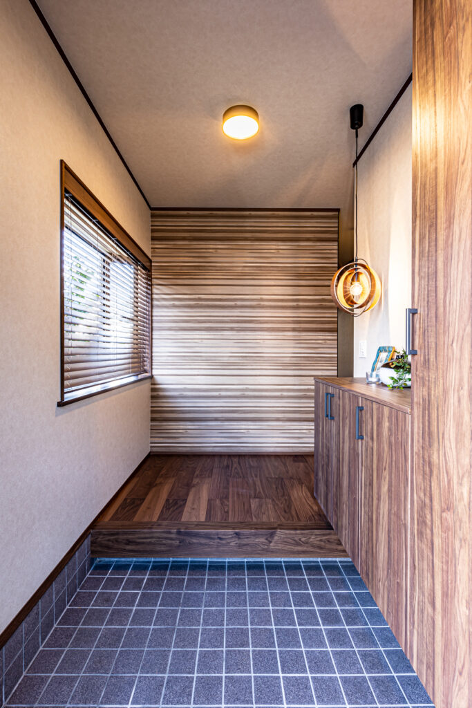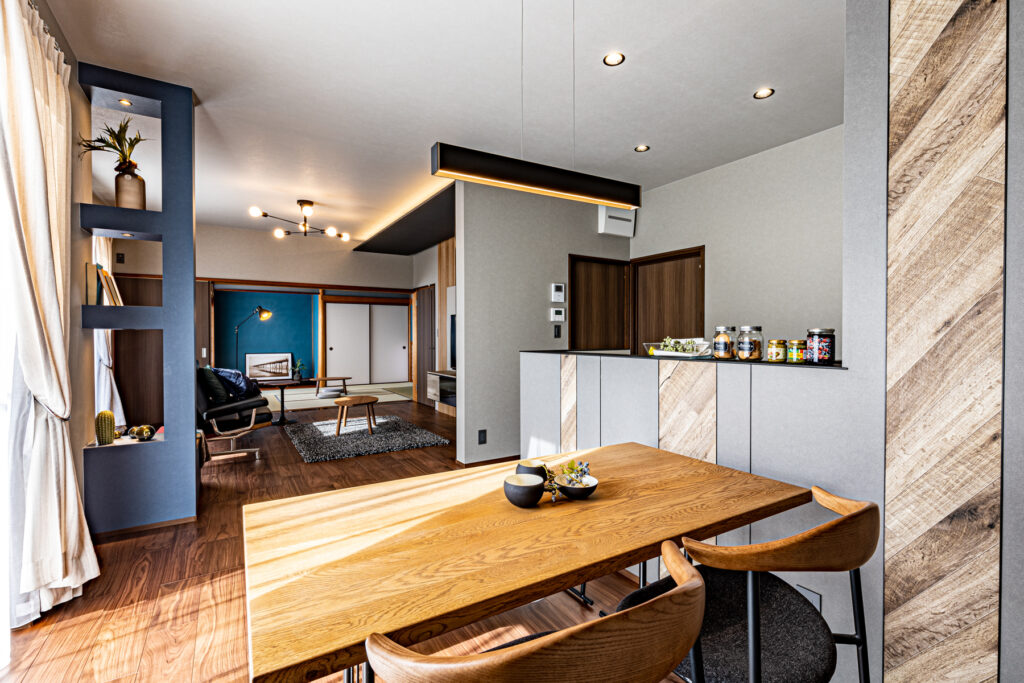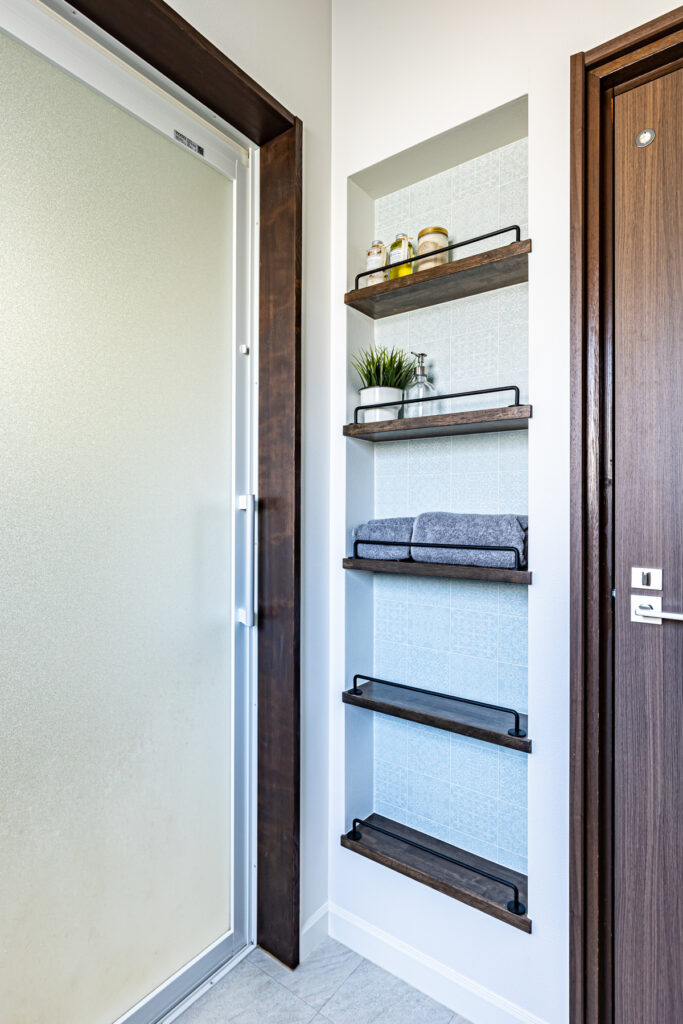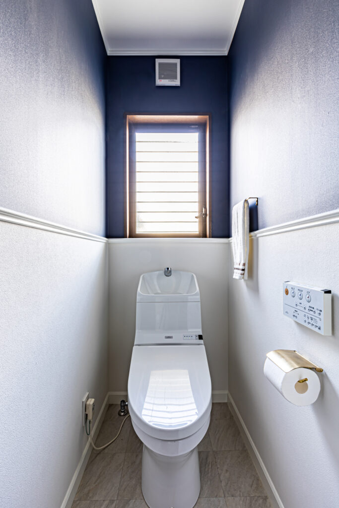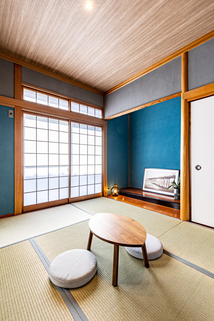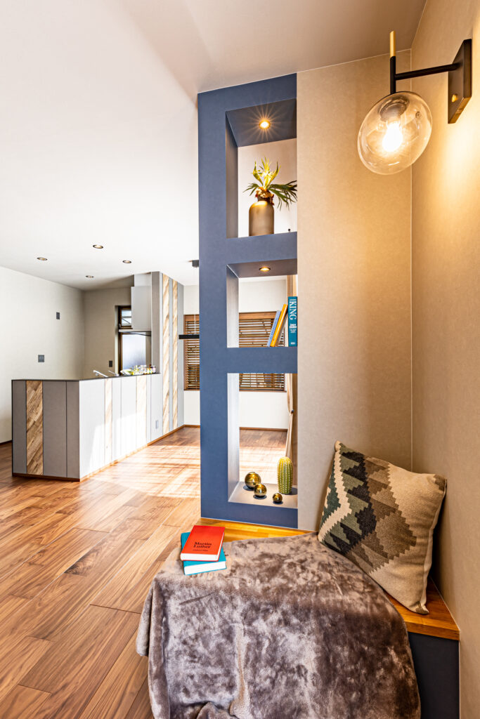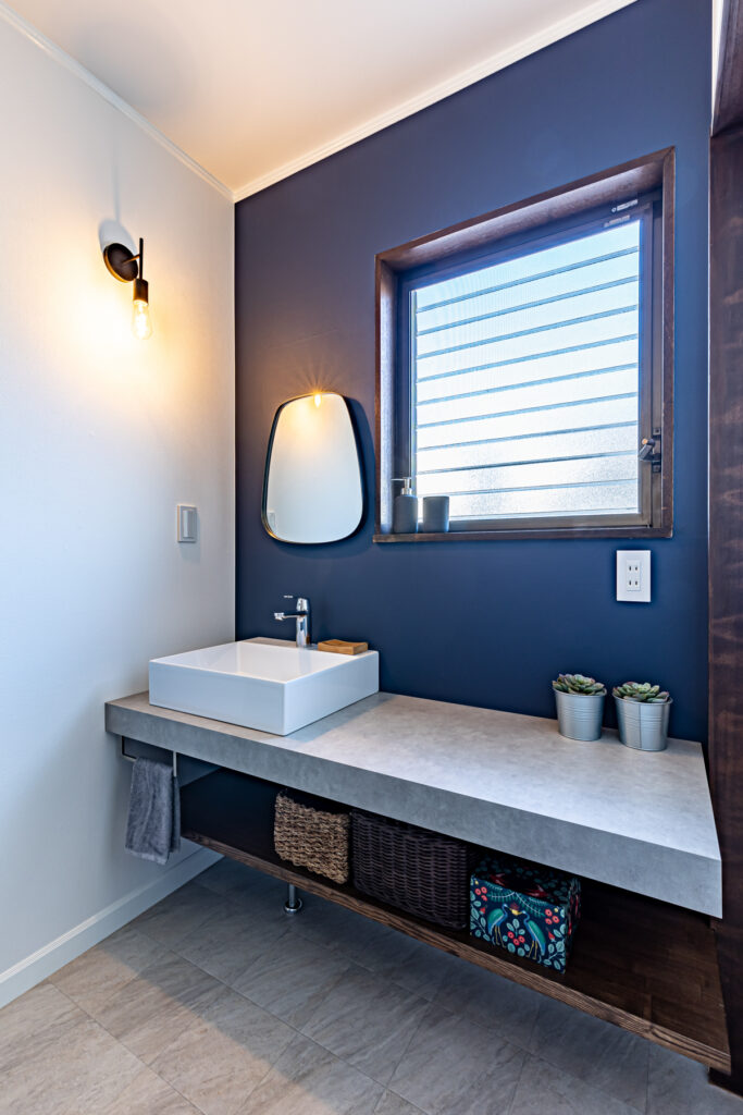 ブルーを基調とした配色が、室内に静けさと品格を添えています。和室ではグレーとブルーの塗り壁を使い分け、視覚に変化を与えました。洗面室やニッチ収納にも、それぞれの場所にふさわしい表情を持たせています。細部にまで行き届いた色と質感の選択が、日常に上質な心地よさを届けています。