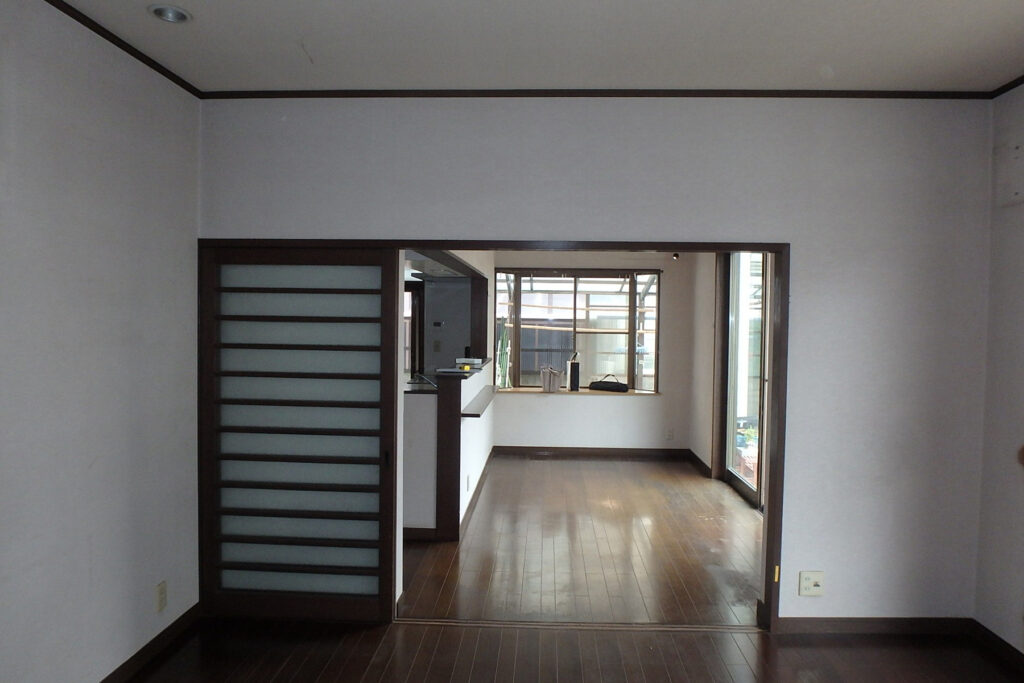 和室とリビング、ダイニングを隔てていた壁を取り払い、ひとつながりの大きな空間へと生まれ変わりました。和室には居間と同じ色調を用い、扉を開けたときにも違和感なく溶け込みます。TVを設置する壁面は一段前に出し、壁紙と木、タイルという三つの異なる素材をすっきりと納めて、視線に奥行きをもたらしています。