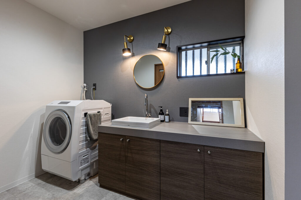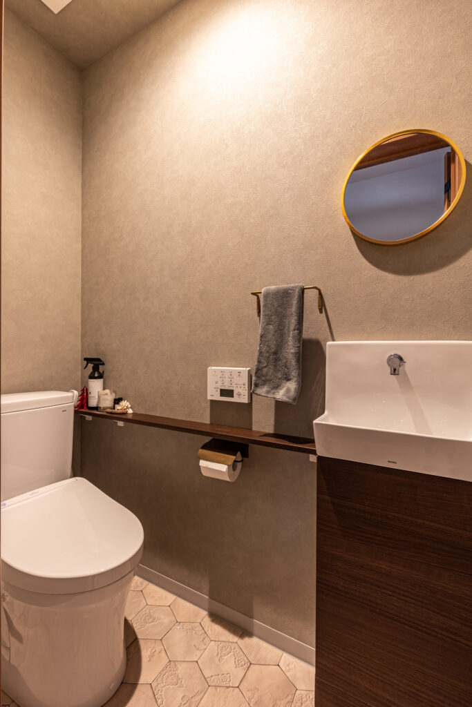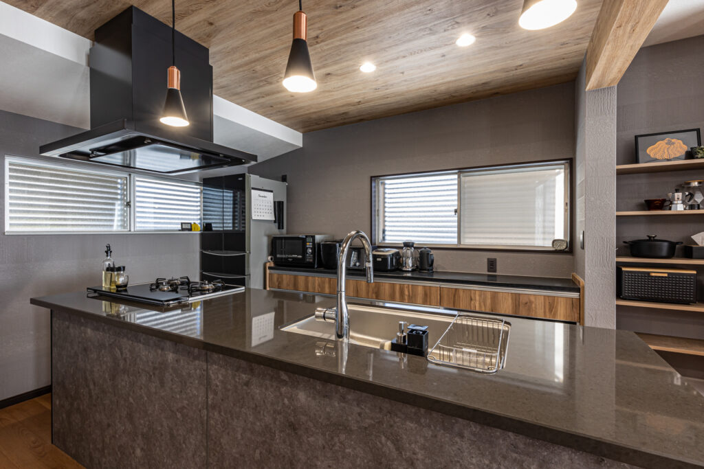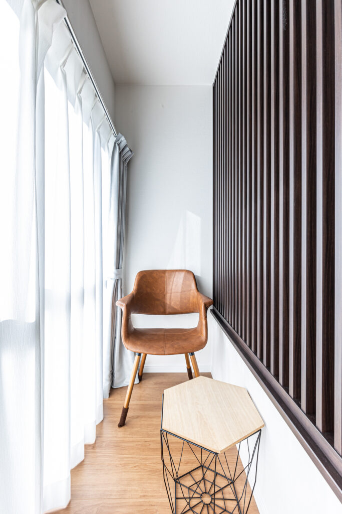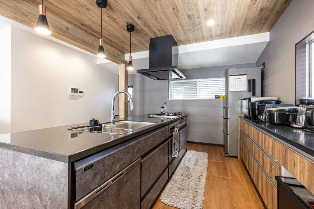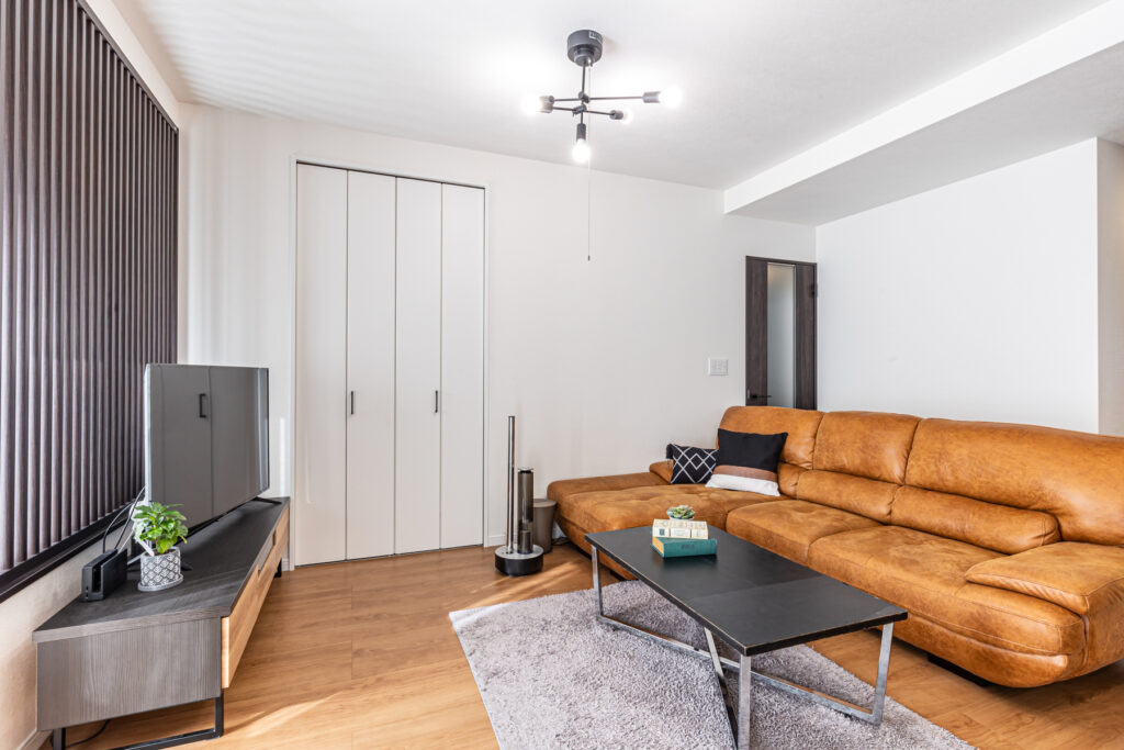グレーとホワイトのメリハリある配色に、木目やブラウンを取り入れたナチュラルシックな内装が、住まい全体を落ち着いた雰囲気で包み込みます。照明器具のほとんどをIさん自身が用意して、細部まで妥協しないこだわりが随所に光ります。視線の抜けと程よい仕切りを演出する空間が、お気に入りに囲まれた毎日を特別なものに変えていきます。