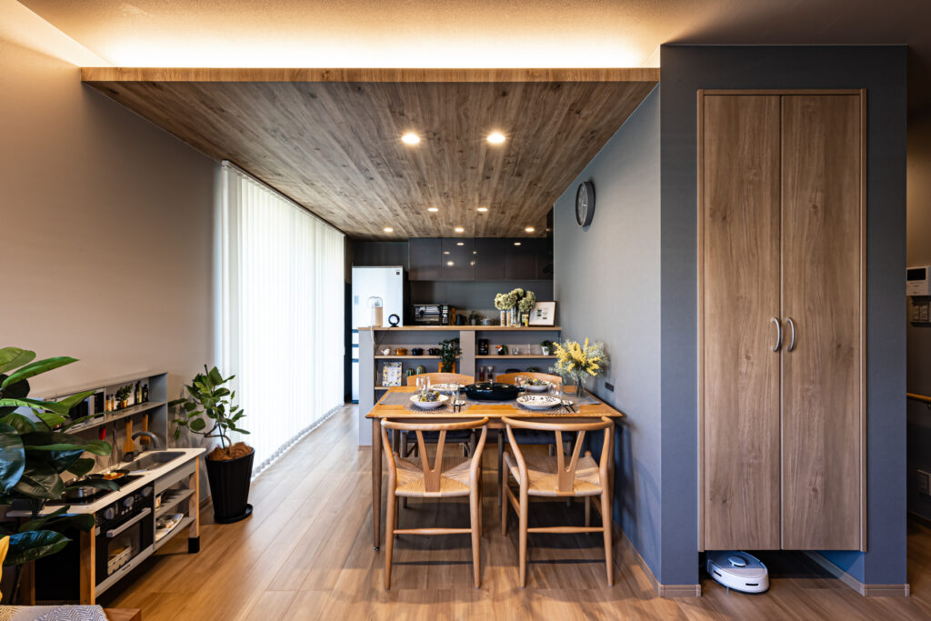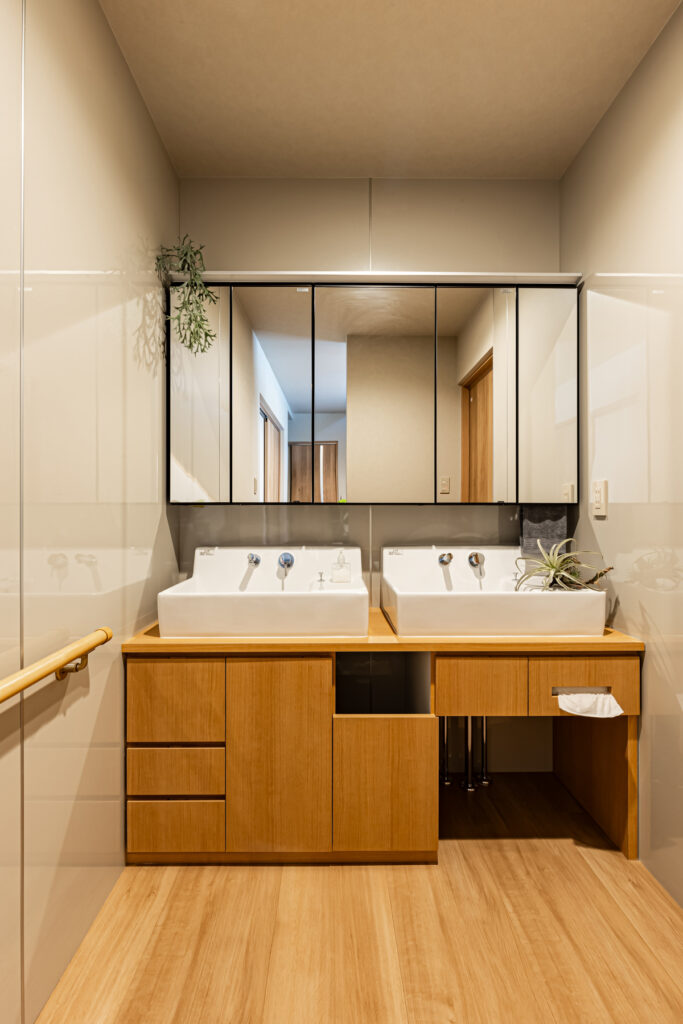 住まいの中心に片付けスペースを設け、移動のついでに整理整頓ができる回遊動線を実現。キッチンから水回りまでは3歩で移動でき、料理と洗濯の家事がスムーズに。入り組んでいた間取りをシンプルに組み直し、動線を整えたことで、空間的にも気持ち的にもゆとりが生まれました。構造上必要な柱を生かした工夫や、大容量のオープン収納など、小さな配慮が毎日を支えています。