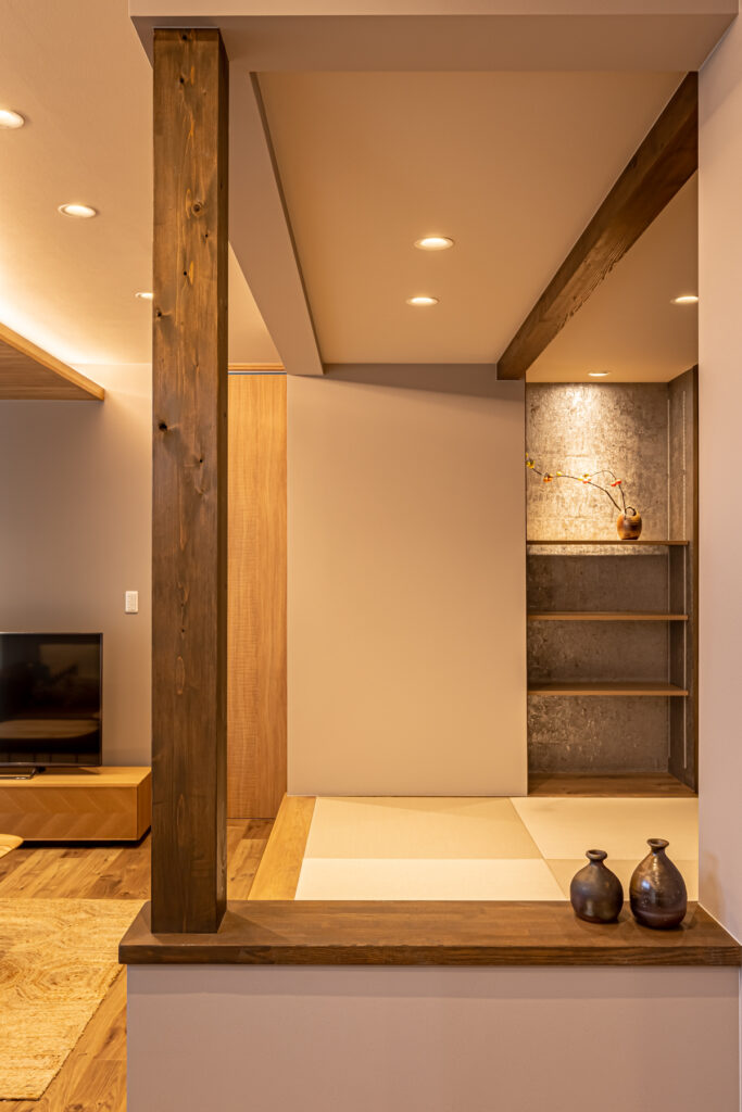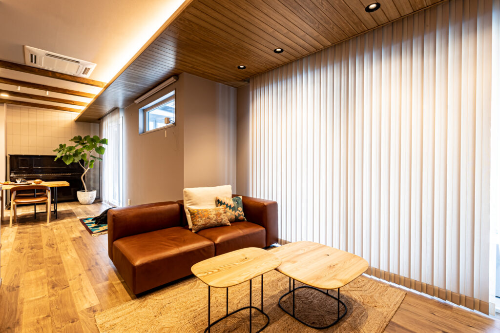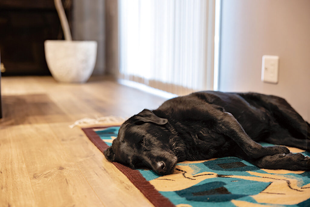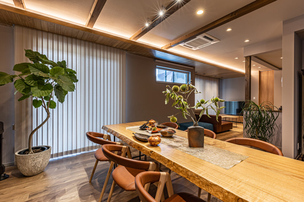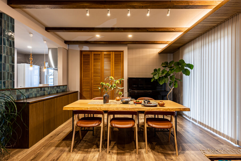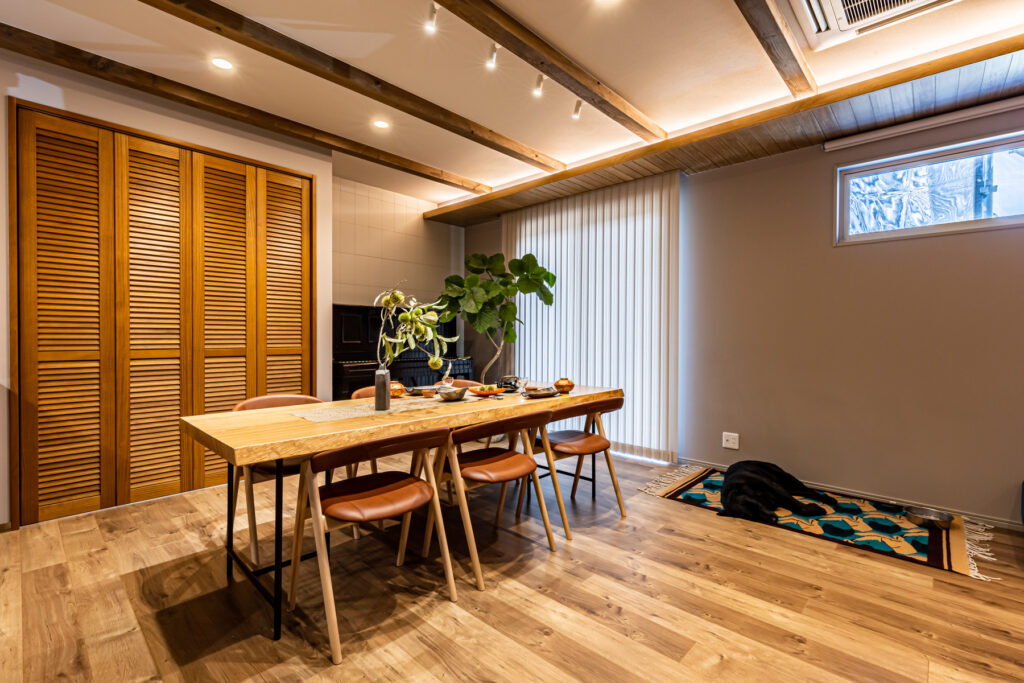 ダイニングとリビングを緩やかにゾーニングし、それぞれが思い思いの時間を過ごしながらも、互いの気配を感じられる心地よい空間が実現しました。性能を向上させたことで、安心安全の住まいへと生まれ変わり、夏は涼しく冬は暖かい環境に。新しく2匹の犬も家族に迎え、穏やかでゆとりある暮らしが始まりました。上質な時間が、ここから静かに流れていきます。