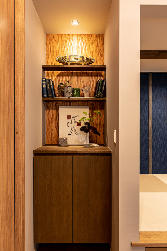 ご夫婦の部屋を1階に設け、1階のみで生活が完結する間取りを実現。洗面・キッチン・リビングを回遊できる動線のおかげで、日々の家事がスムーズに運びます。細かく区切られていた部屋を大胆に組み直し、広々としたLDKが誕生。異素材を組み合わせた上質な空間は、まるでラグジュアリーホテルのよう。細部まで計算された設計が、ゆとりある暮らしを支えています。