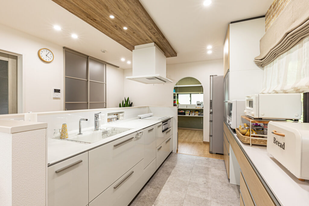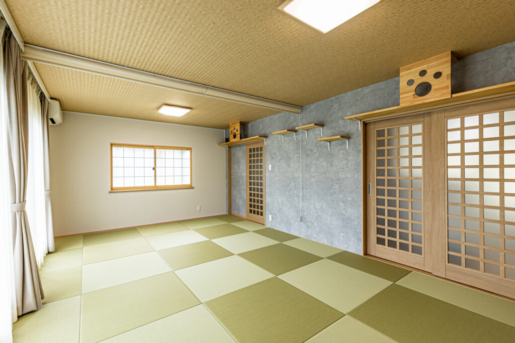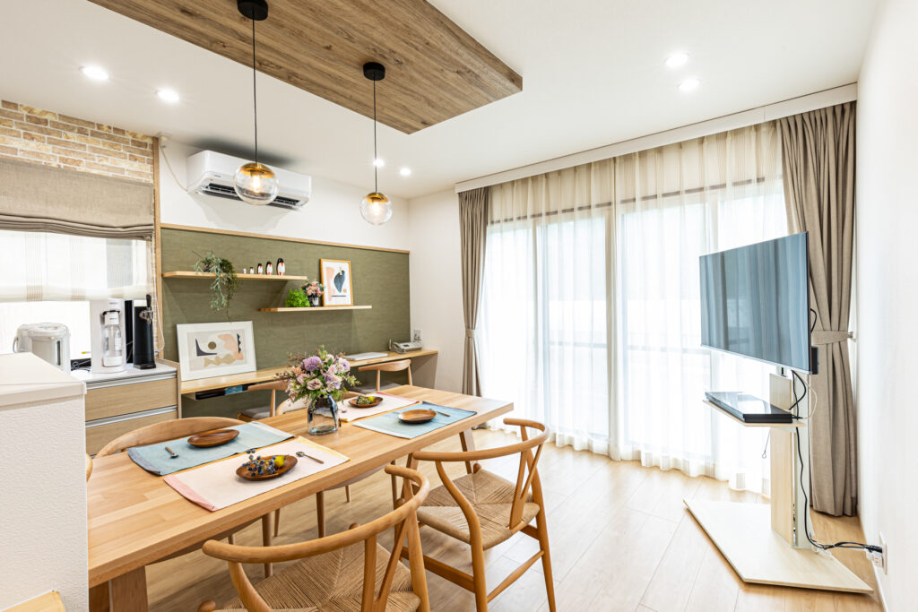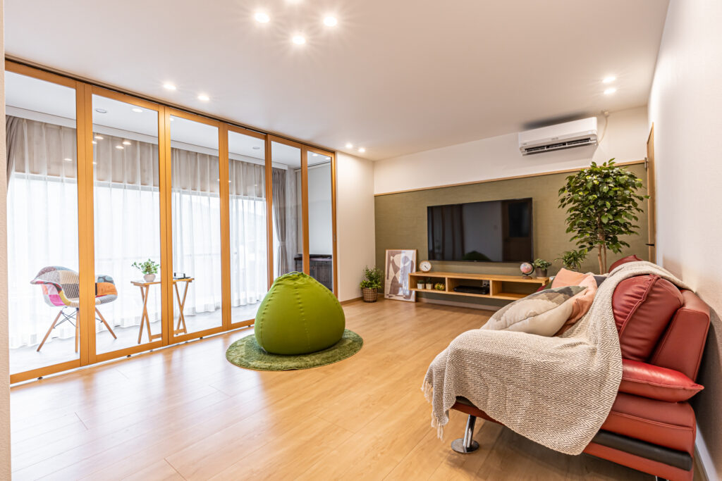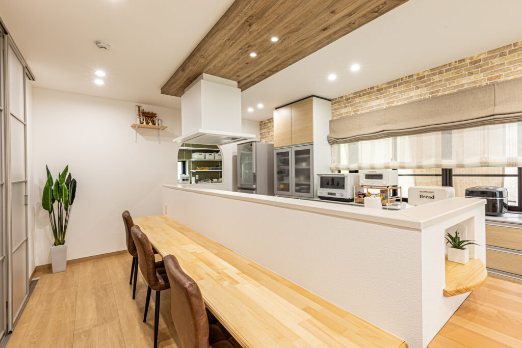 大きなガラスの間仕切りを設けたことで、光がたっぷりと差し込むリビングが実現。広縁はインナーテラスとして生まれ変わり、室内外の連続性を感じさせます。2部屋をつなげた広い和室は、お孫さんたちのお泊り部屋として活躍。配膳が楽な横並びのダイニングとキッチンは、食事の準備から片付けまでスムーズに運び、家族の時間を豊かにします。