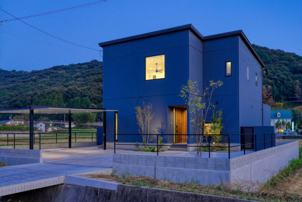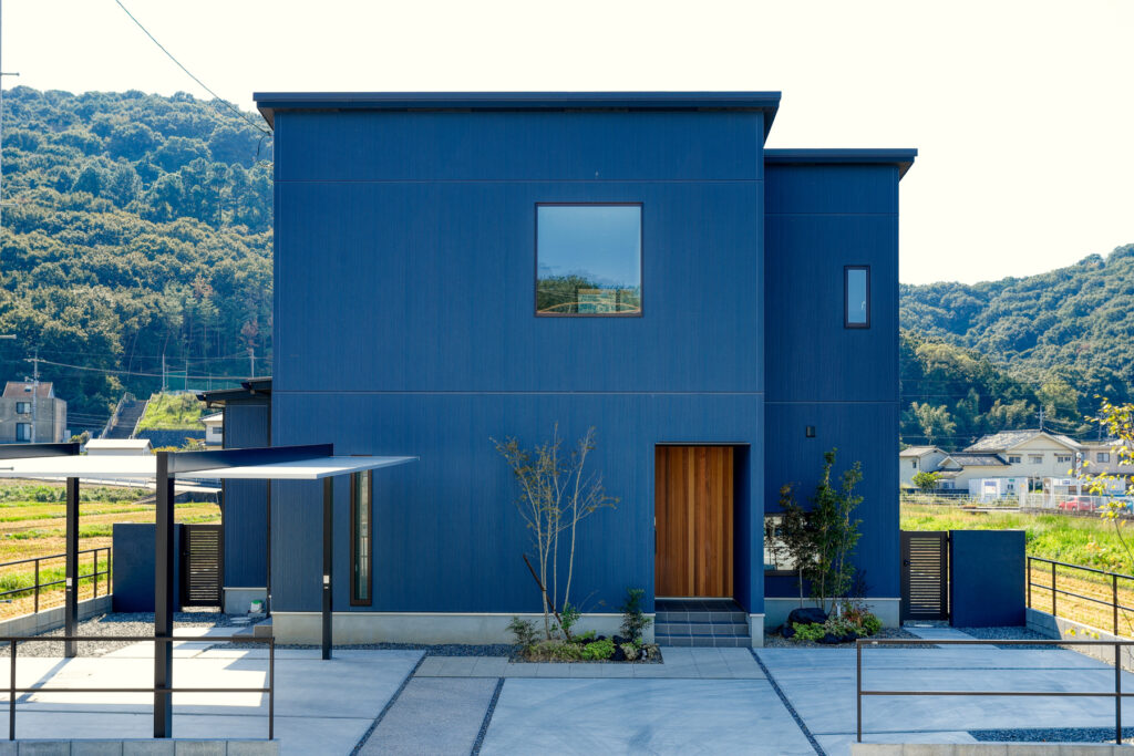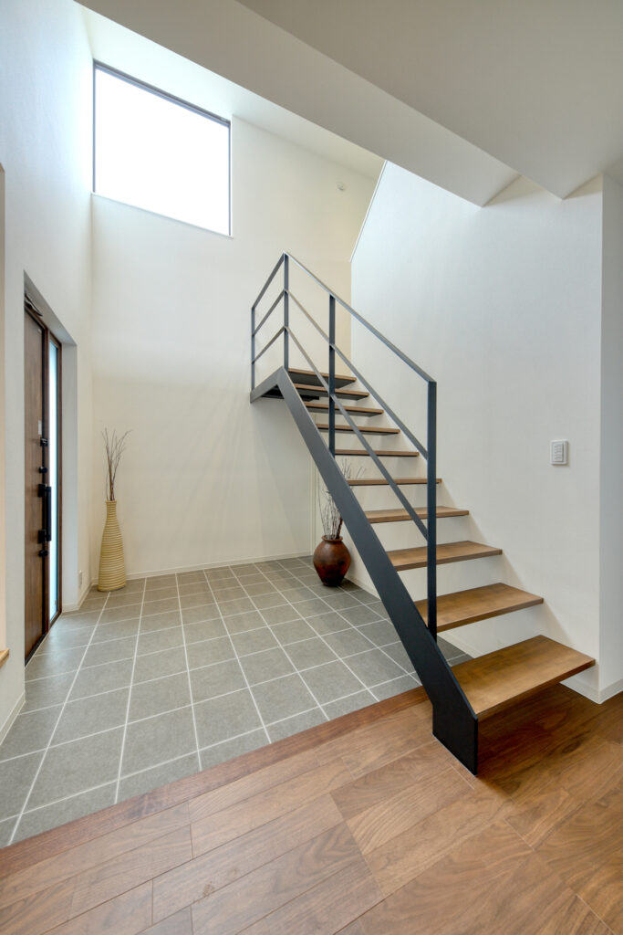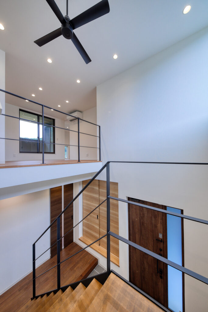 外観はシンプルかつ重厚な佇まいで、断熱材や高性能サッシを採用し、C値0.3㎠/㎡という高い気密性を実現。太陽光発電4.76kW も搭載し、将来のV2H対応も視野に入れた設計です。玄関ホールにはアイアン階段と吹き抜けを設け、訪れる人に洗練された印象を与えます。自然素材の質感が日常に豊かな表情を添え、長く快適に住み継げる住まいを目指しました。