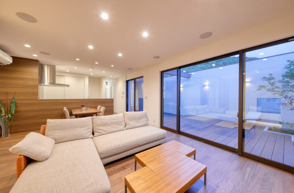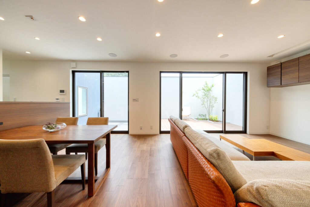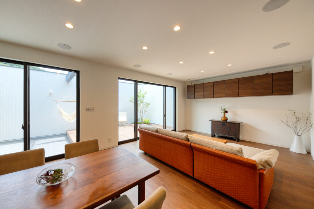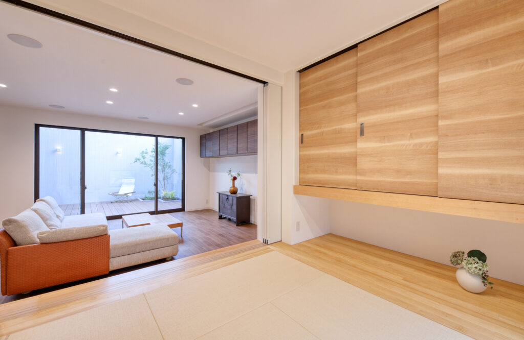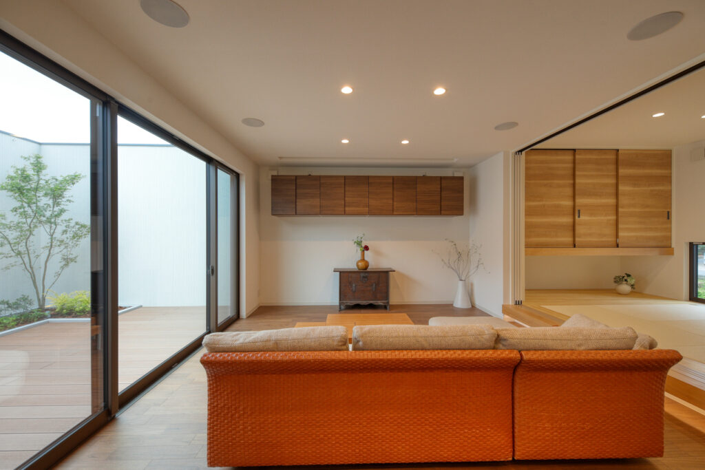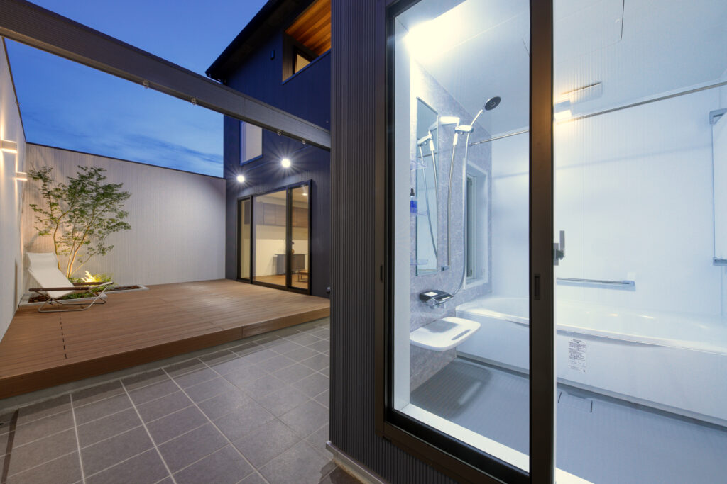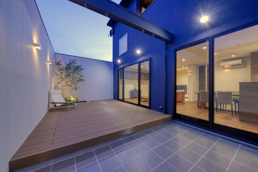 16帖超の中庭は、樹脂デッキとタイル敷きの両方を備え、家族やゲストが思い思いに過ごせるぜいたくな設えです。周囲の視線を遮りながら、光や風をたっぷり取り込む設計で、アウトドアリビングや水遊び、食事など多目的に活用できます。夜には月明かりや星空を眺めながら、静かなひとときを楽しむことも可能です。屋外と屋内が緩やかにつながり、四季折々の表情を感じられる住まいとなっています。