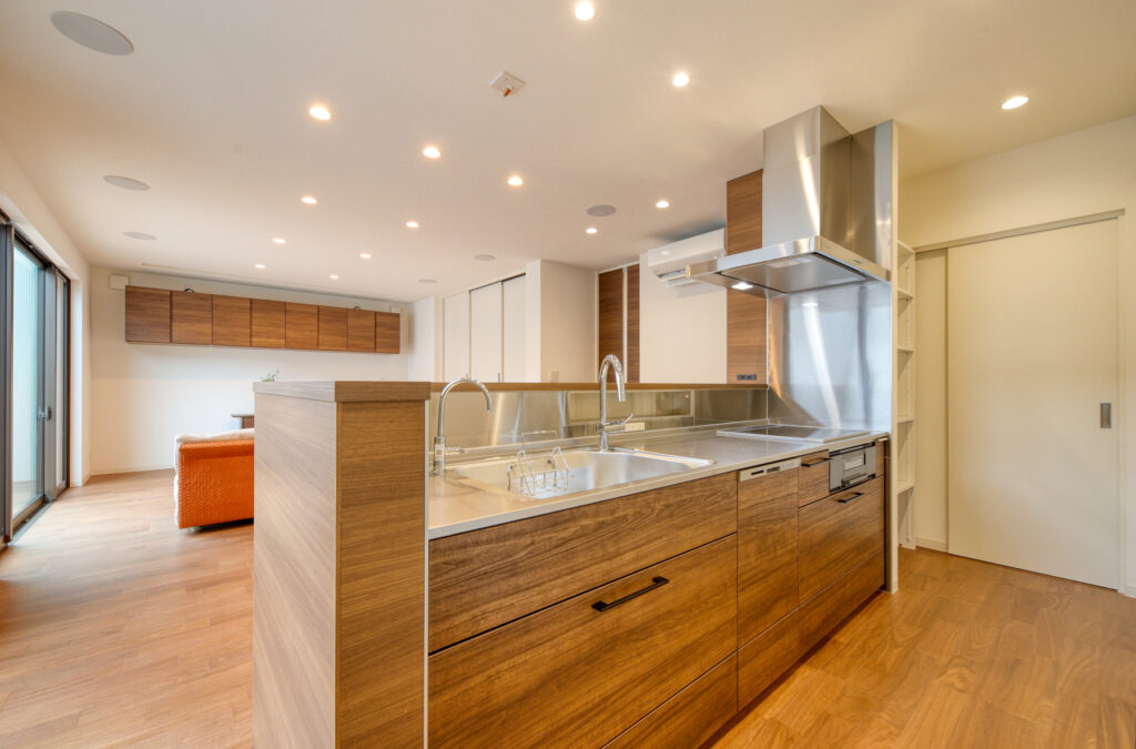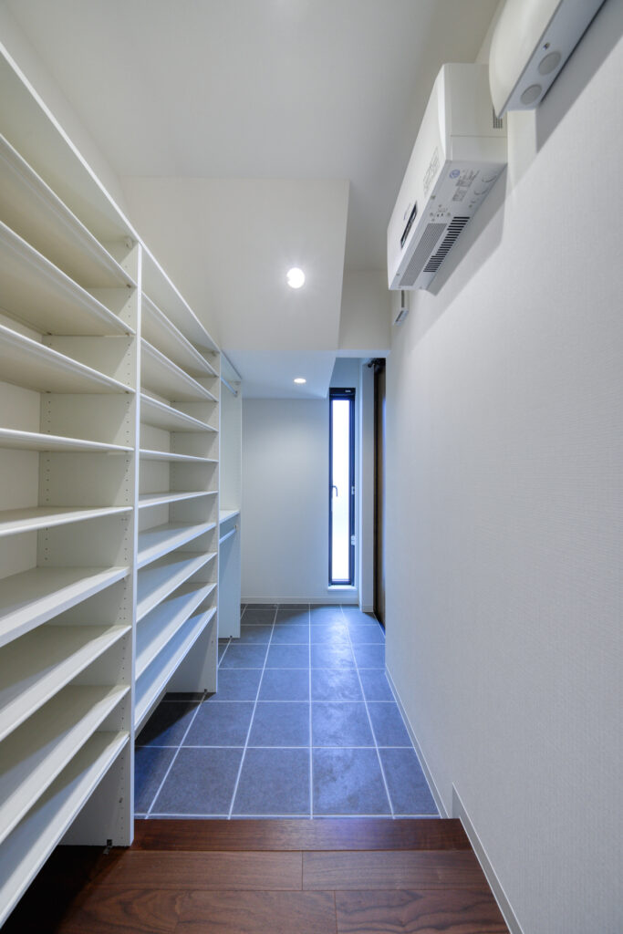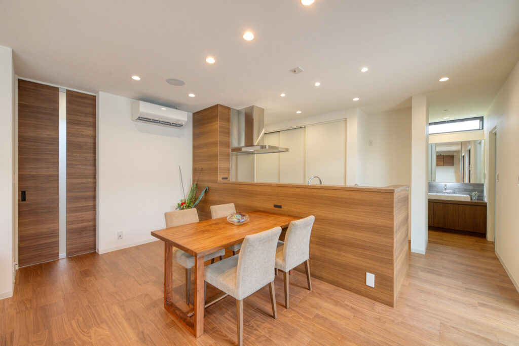 玄関からファミリークローゼット、洗面、LDKへと直線的にアクセスできる動線を実現。帰宅後すぐに荷物を片付け、手洗いを済ませてからリビングへ向かう流れは、衛生面にも配慮した設計です。大容量の収納スペースを確保し、日々の片付けや衣類管理もスムーズ。浴室は中庭と隣接し、外遊び後の入浴や露天風呂感覚のバスタイムもかないます。家事と育児のしやすさを徹底的に追求したプランです。