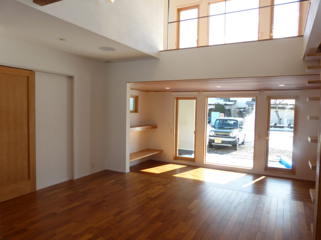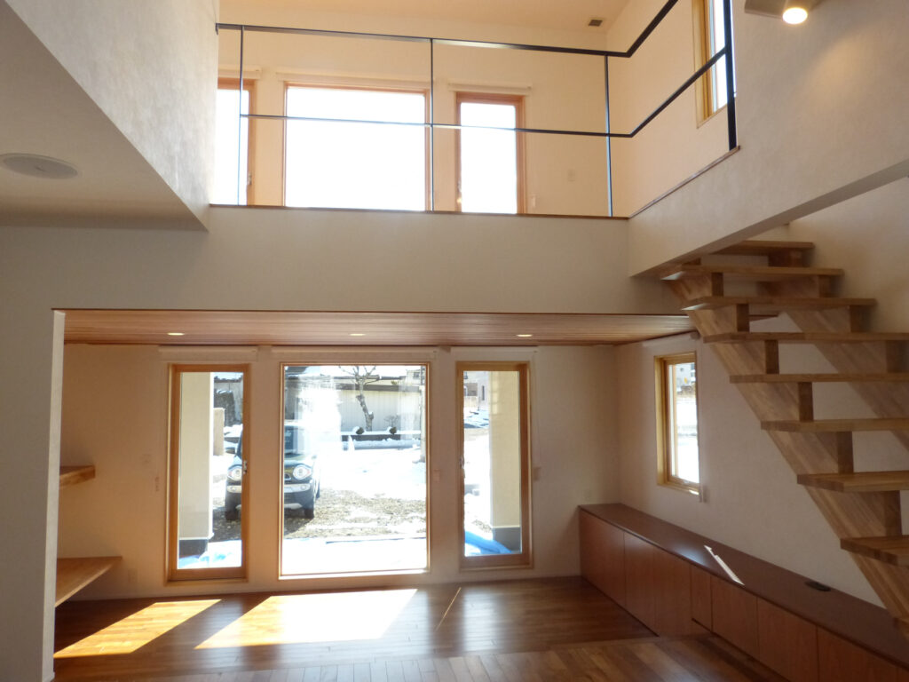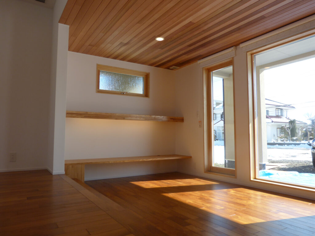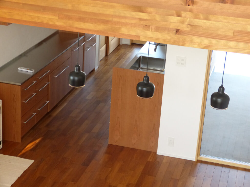 リビングにはチーク材を採用し、段差で緩やかに区切り、視覚的な広がりと機能的な区分けを両立させました。冬には吹き抜けを通して光を取り入れ、室内に陽だまりを届けます。開放感と落ち着きが共存する居住空間は、家族それぞれの時間を尊重しながらも、自然なつながりを育んでいます。