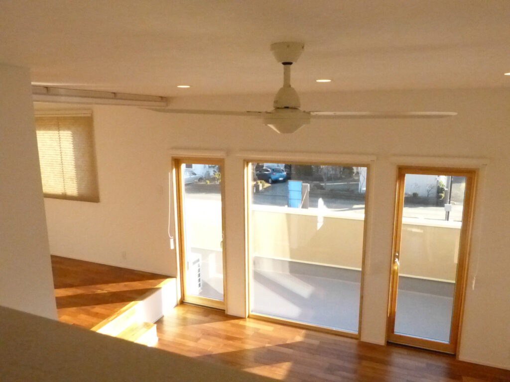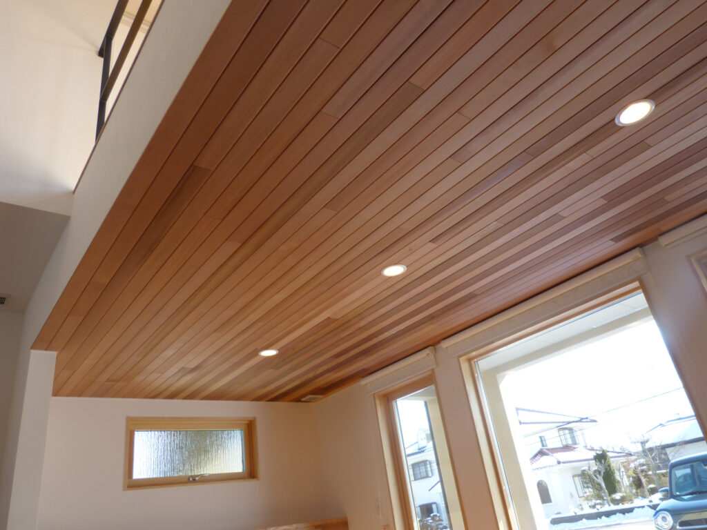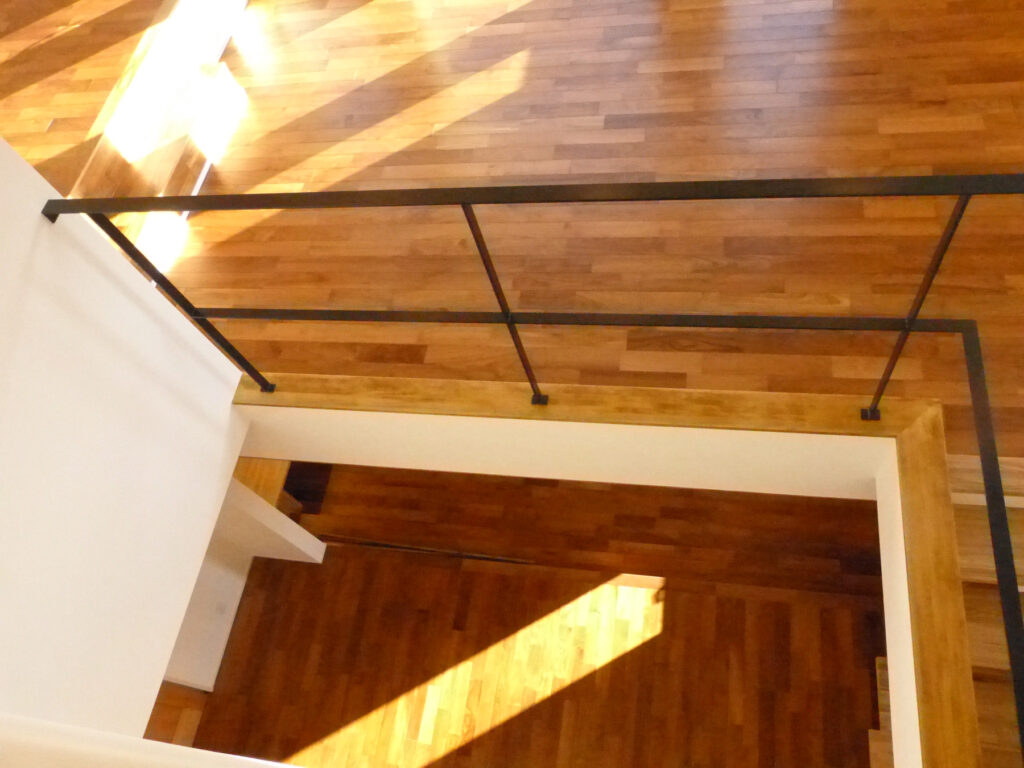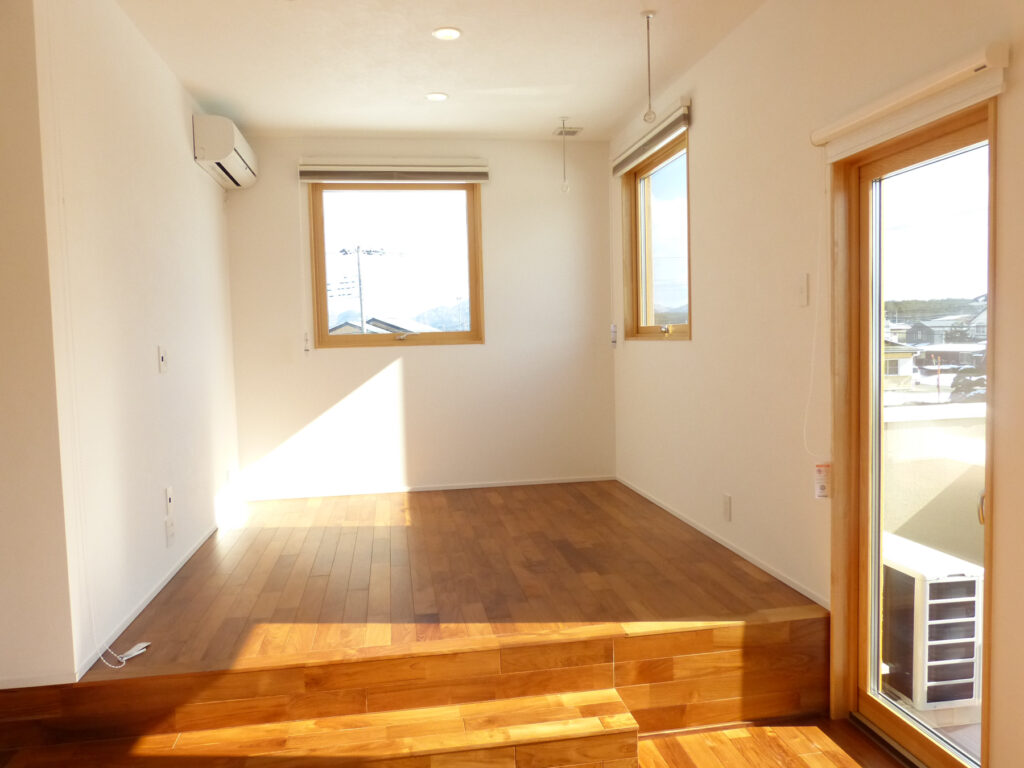 リビングにはチーク材を採用し、段差で緩やかに区切り、視覚的な広がりと機能的な区分けを両立させました。冬には吹き抜けを通して光を取り入れ、室内に陽だまりを届けます。開放感と落ち着きが共存する居住空間は、家族それぞれの時間を尊重しながらも、自然なつながりを育んでいます。