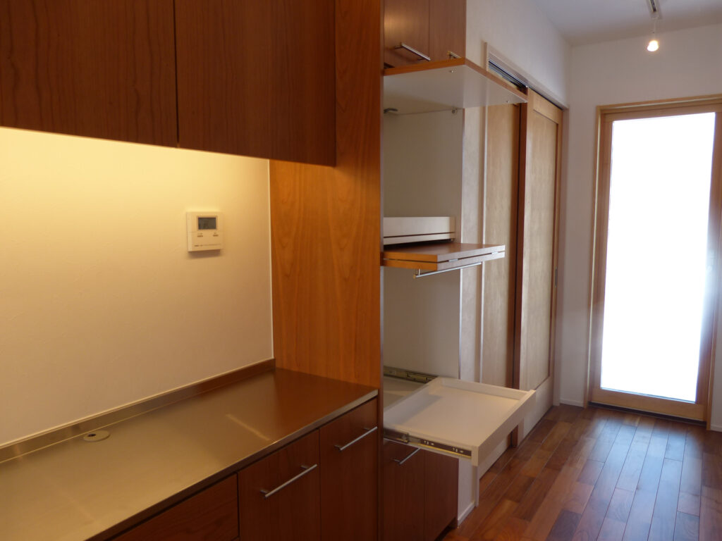 キッチンは素材を一つ一つ吟味し、オーダーメイドに。住まい手の個性を尊重し、家具やインテリアもトータルでコーディネートしています。造作洗面台はタイルでセンスよく仕上げ、日常の身支度が楽しくなる演出を。機能性だけでなく、美意識が息づく設えが、毎日の家事時間を豊かに彩ります。