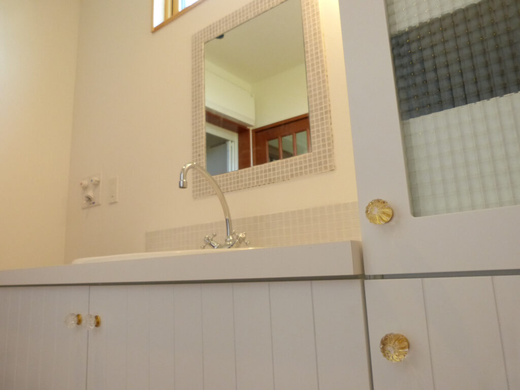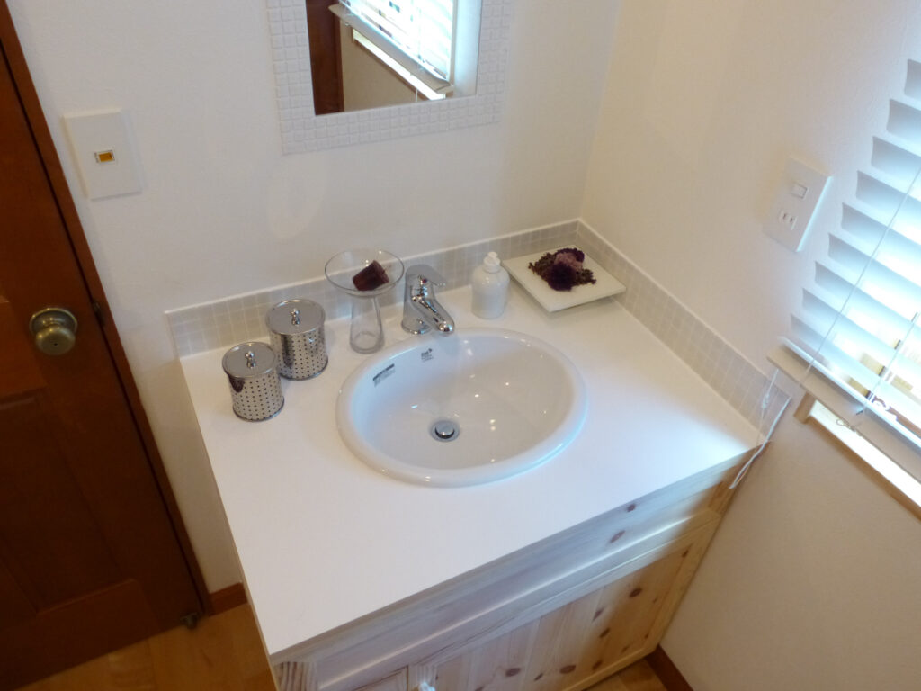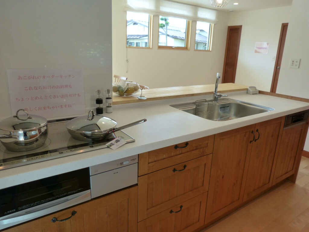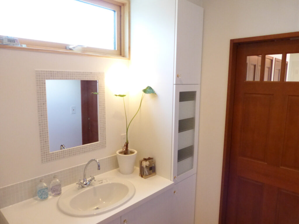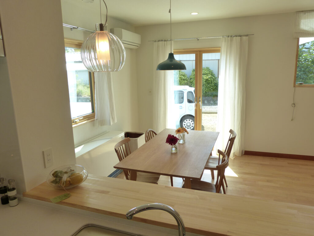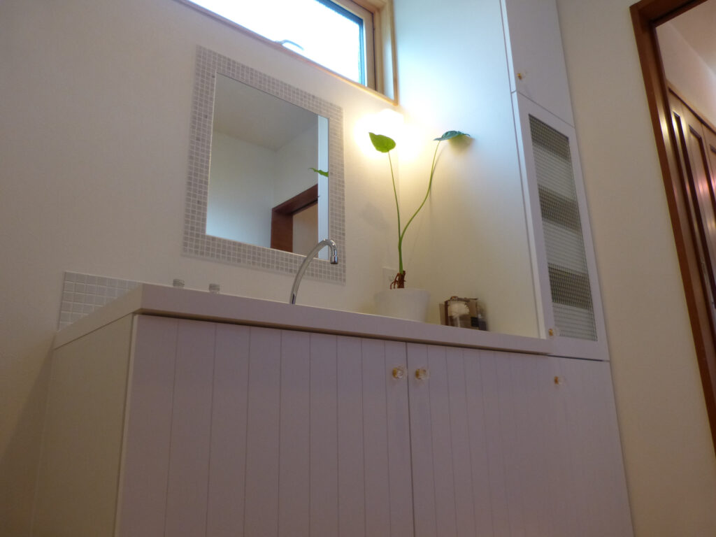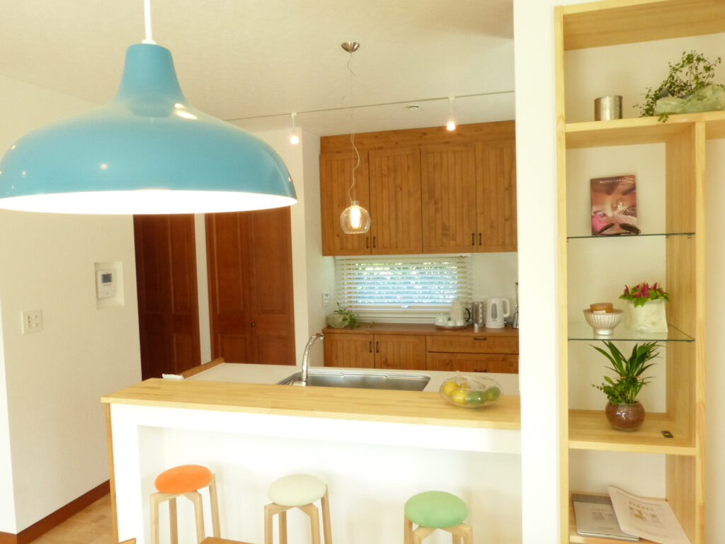 LDKは無垢材のフローリングと白い塗り壁で統一し、明るく開放的な雰囲気を実現しています。対面式キッチンは木製キャビネットとホワイトの天板を組み合わせ、機能性と美しさを両立。洗面台や収納棚も造作で仕立て、住まい手の個性を反映させました。随所に配したニッチ棚が、日常に彩りを添えます。