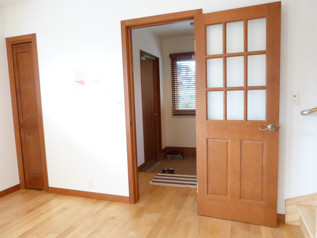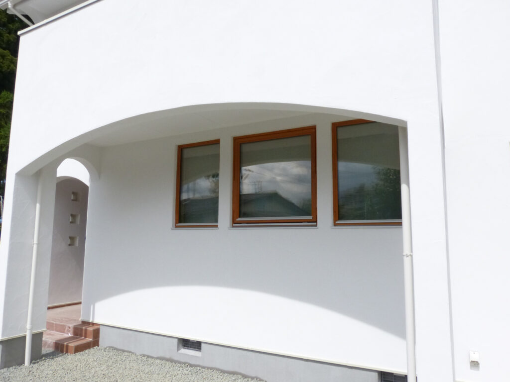 白い塗り壁にアーチ状の曲線を描いた外観は、街並みに柔らかな表情を添えます。木製サッシがぬくもりを演出し、シンプルながらも個性が光る佇まいです。玄関には木の造作建具を用い、白い塗り壁にやさしいアクセントを添えています。訪れる人を優しく迎え入れる、親しみやすいファサードに仕上げました。