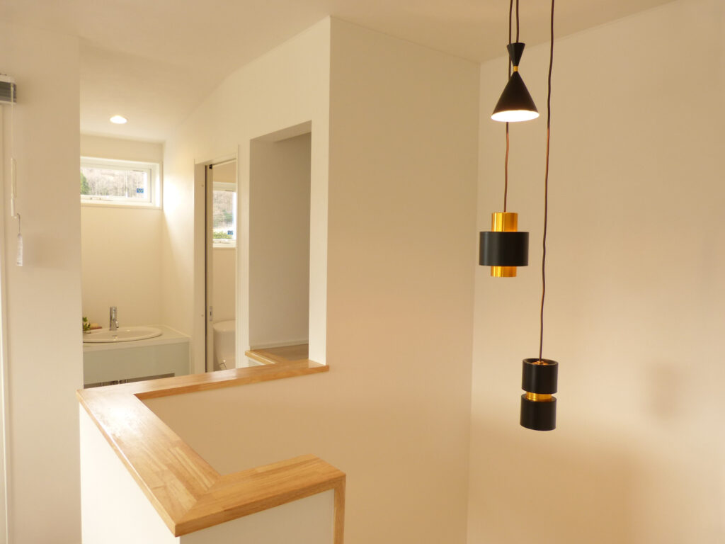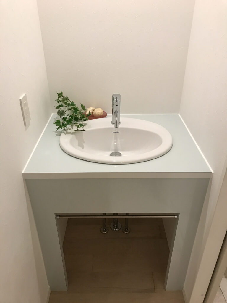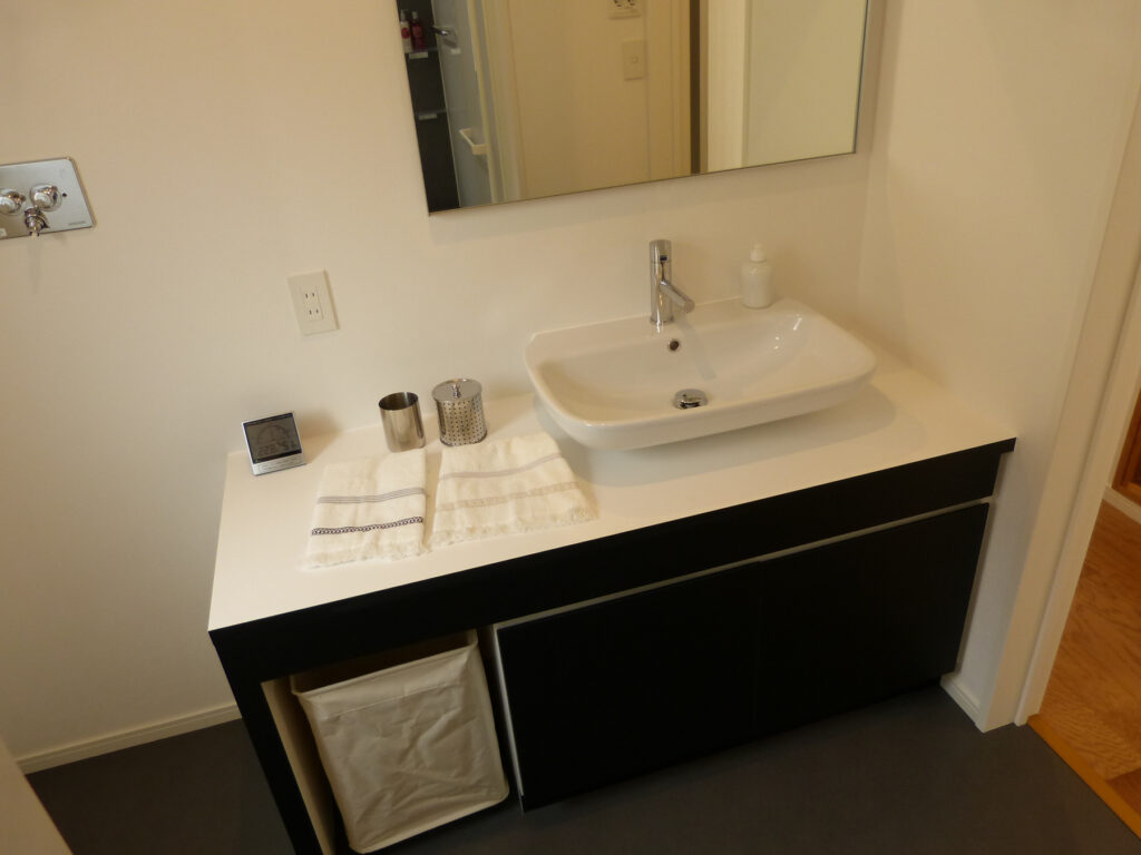 ブラックキャビネットに白いカウンターを組み合わせた造作洗面台は、収納力と意匠性を兼備しています。ミラーはフレームレスで壁面に溶け込み、視覚的な広がりを演出しています。もう一方は2階にもトイレの手洗いを兼ねた、コンパクトな独立型洗面台を。