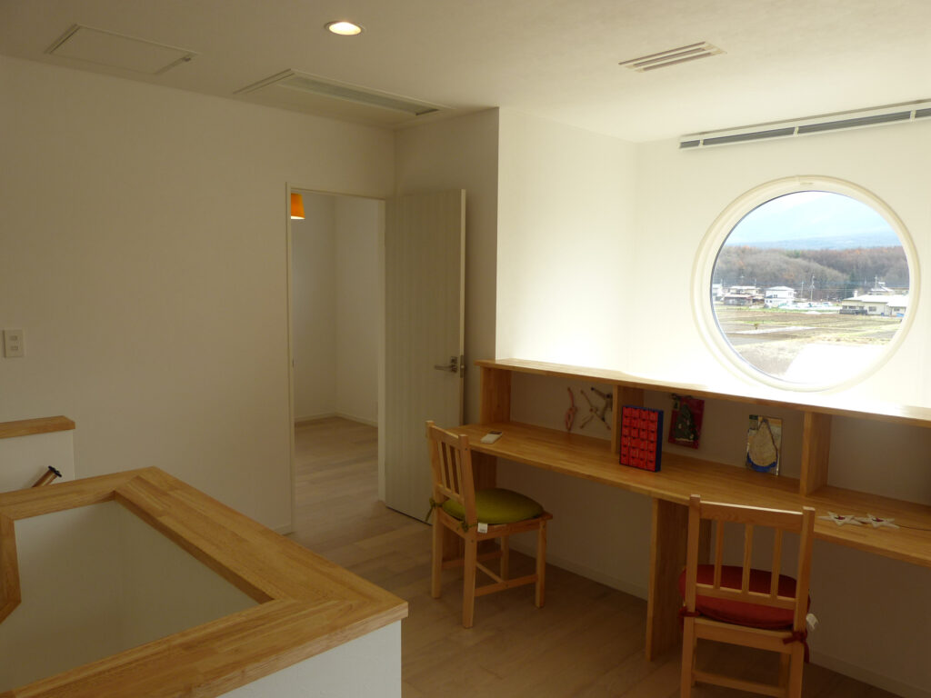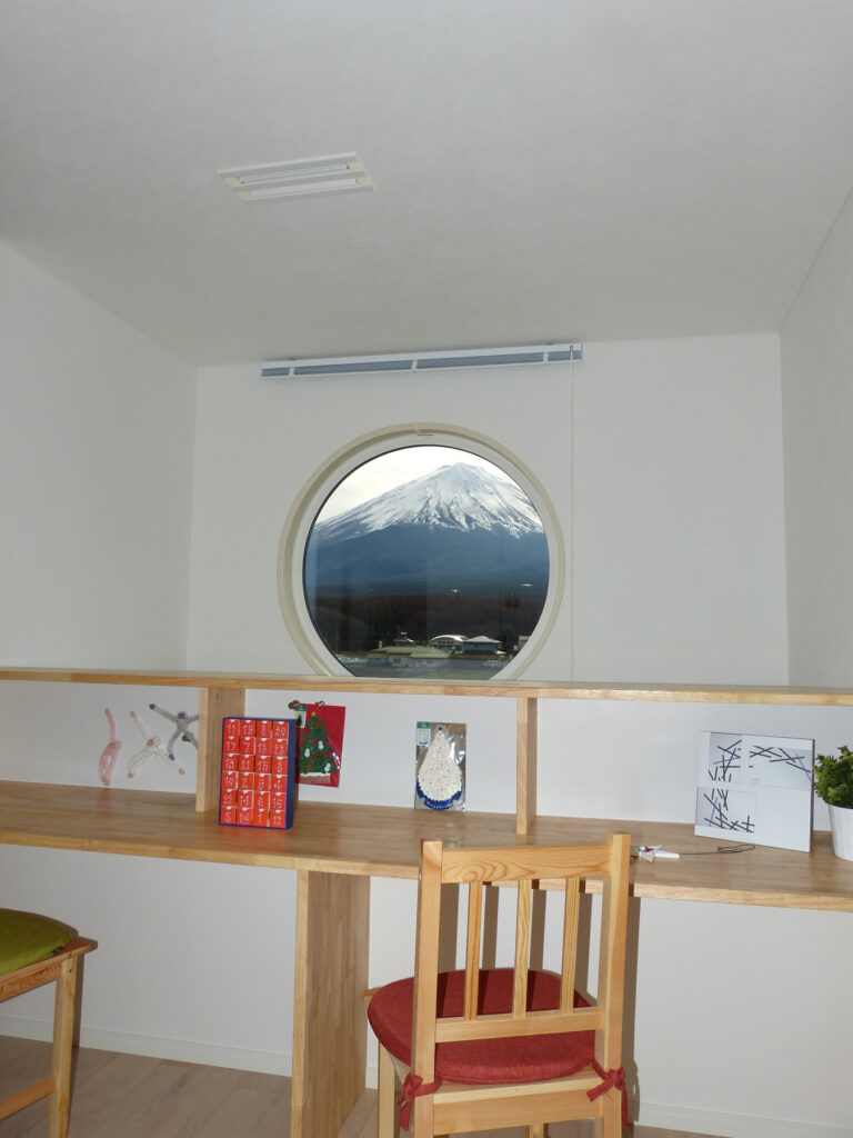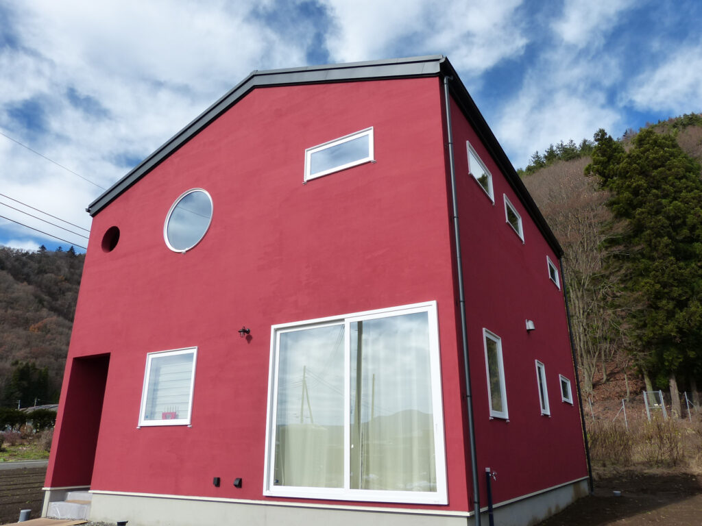 目を引く色みの外壁が青空に映える2階建て住宅。室内に入ると、ピクチャーウィンドウから富士山の雄大な姿が目に飛び込んできます。2階のスタディスペースには丸窓を配し、遊び心と採光を両立。カウンターデスクを窓際に設置し、宿題や読書の時間を特別なものにします。白を基調とした内装は、外観の色彩とは対照的に、落ち着いた雰囲気を醸し出しています。ソファに座ると、窓の外に広がる景色と室内のあたたかみが調和します。