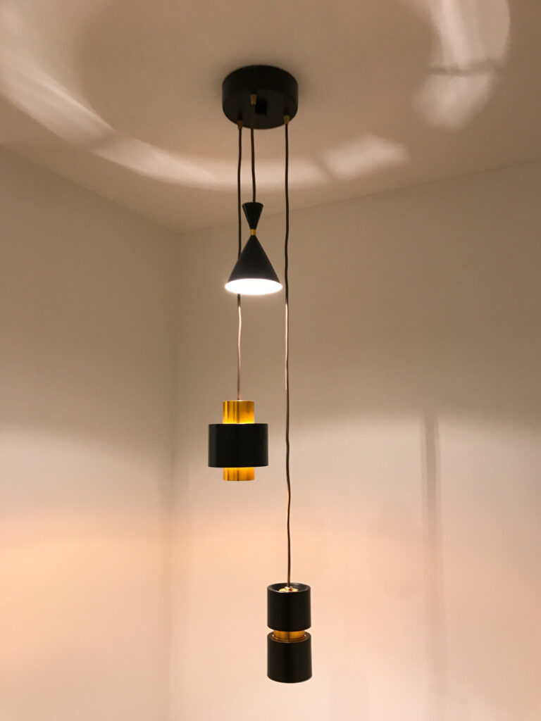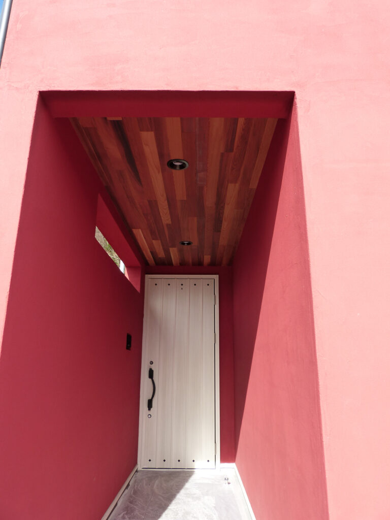 階段吹き抜けには3連のペンダントライトをつり下げ、デザインと高さを変えることで視線に変化を与えます。玄関アプローチもくすみレッドの壁で囲まれ、天井はレッドシダーの木を張って、ホワイトの玄関建具もアクセントに。訪れる人を非日常の世界へと誘います。