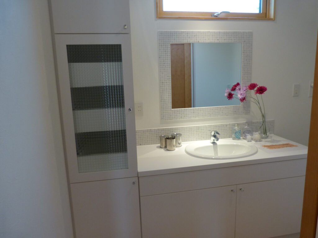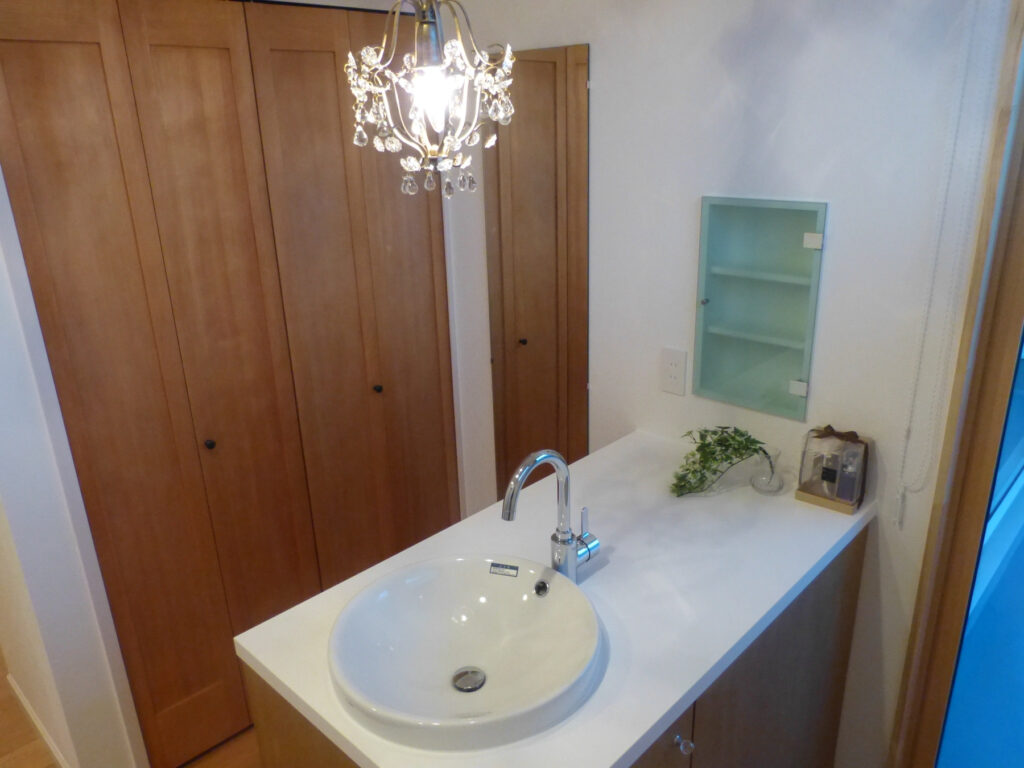 玄関ポーチはアーチ状の天井とニッチ窓を組み合わせ、訪れる人を柔らかく迎え入れます。窓配置はリズムを持たせ、夕暮れ時には室内の灯りが温かな表情を浮かび上がらせ、デッキ部分は海外の雰囲気を演出。洗面室は木製収納扉にシャンデリア照明を採用し、日常に華やかさを添えています。