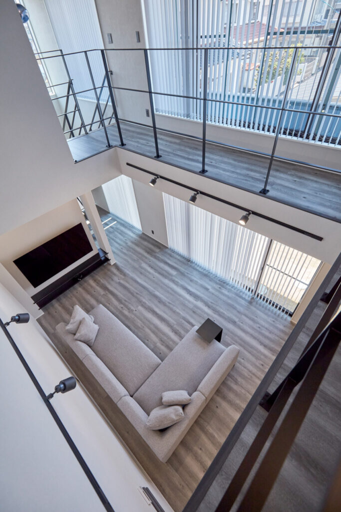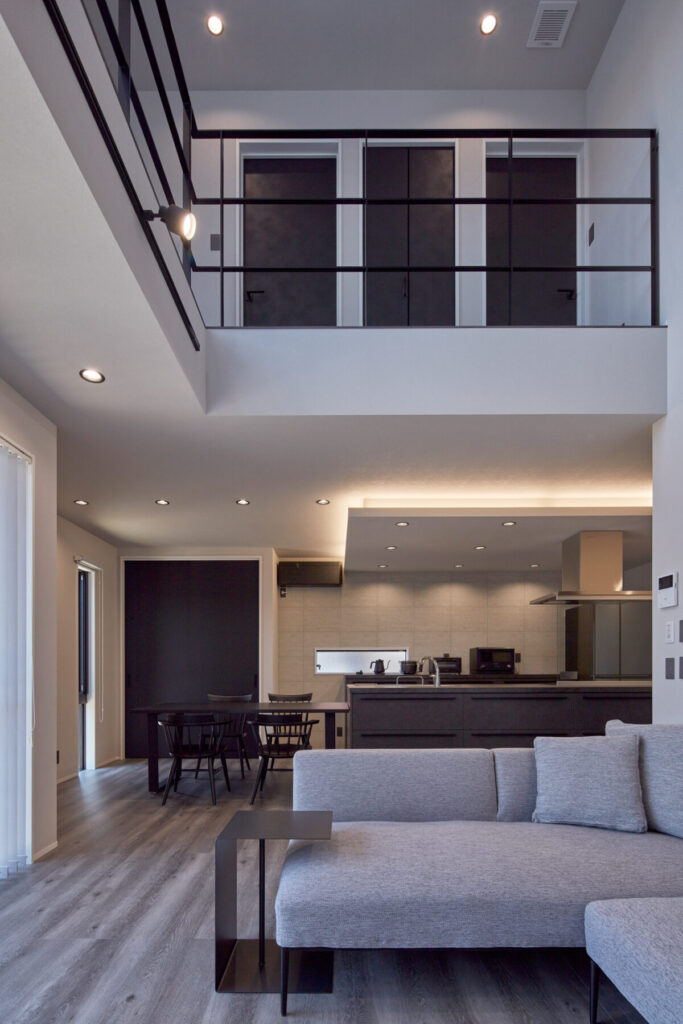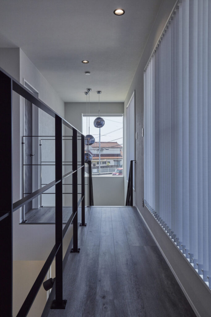 アイアンによる開放的な設計により、階段や廊下までもがひとつの居住空間として機能し、まるでワンフロアのような一体感を実現。吹き抜けを生かした空間演出の最適解と言える、デザイン性と実用性を兼ね備えた住まいです。