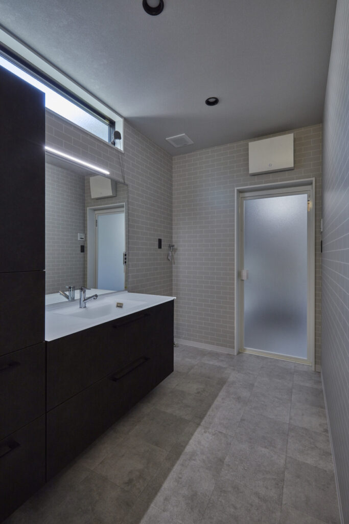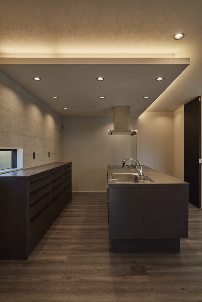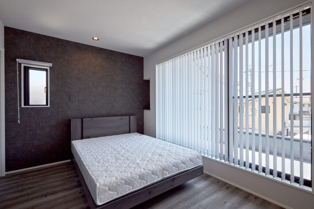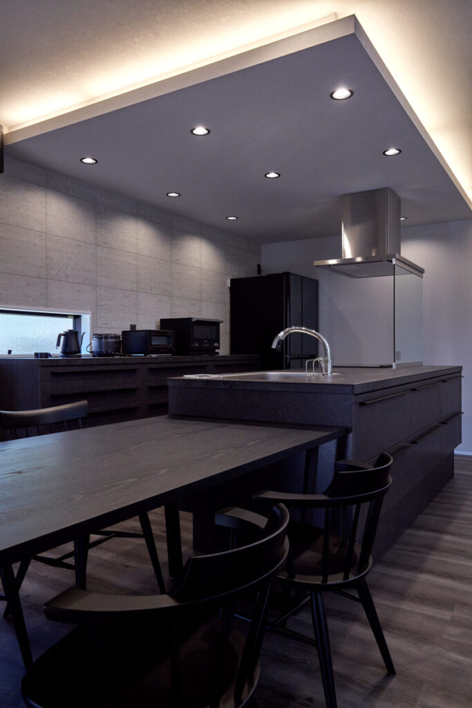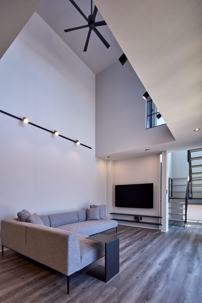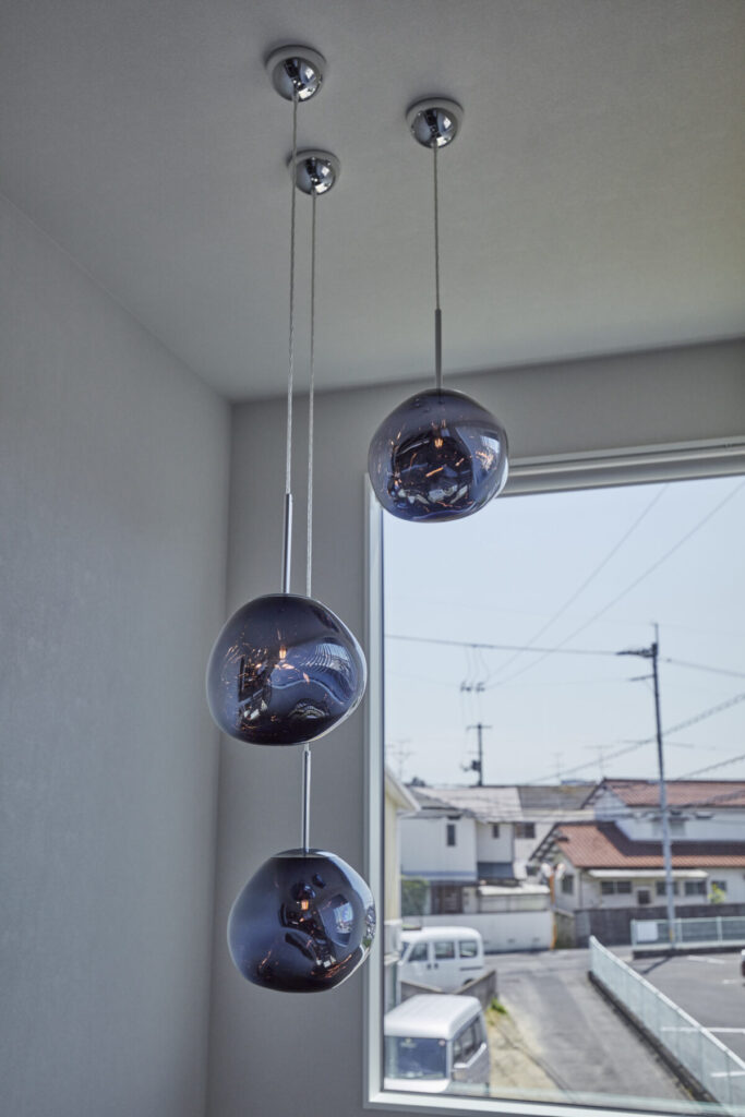 1階と2階をつなぐアイアン階段、そして2階のアイアン手すりが、壁を極限までそぎ落とした設計を可能にしました。横長の間取りと縦長の吹き抜けが調和し、家全体に広がりと「抜け感」をもたらしています。